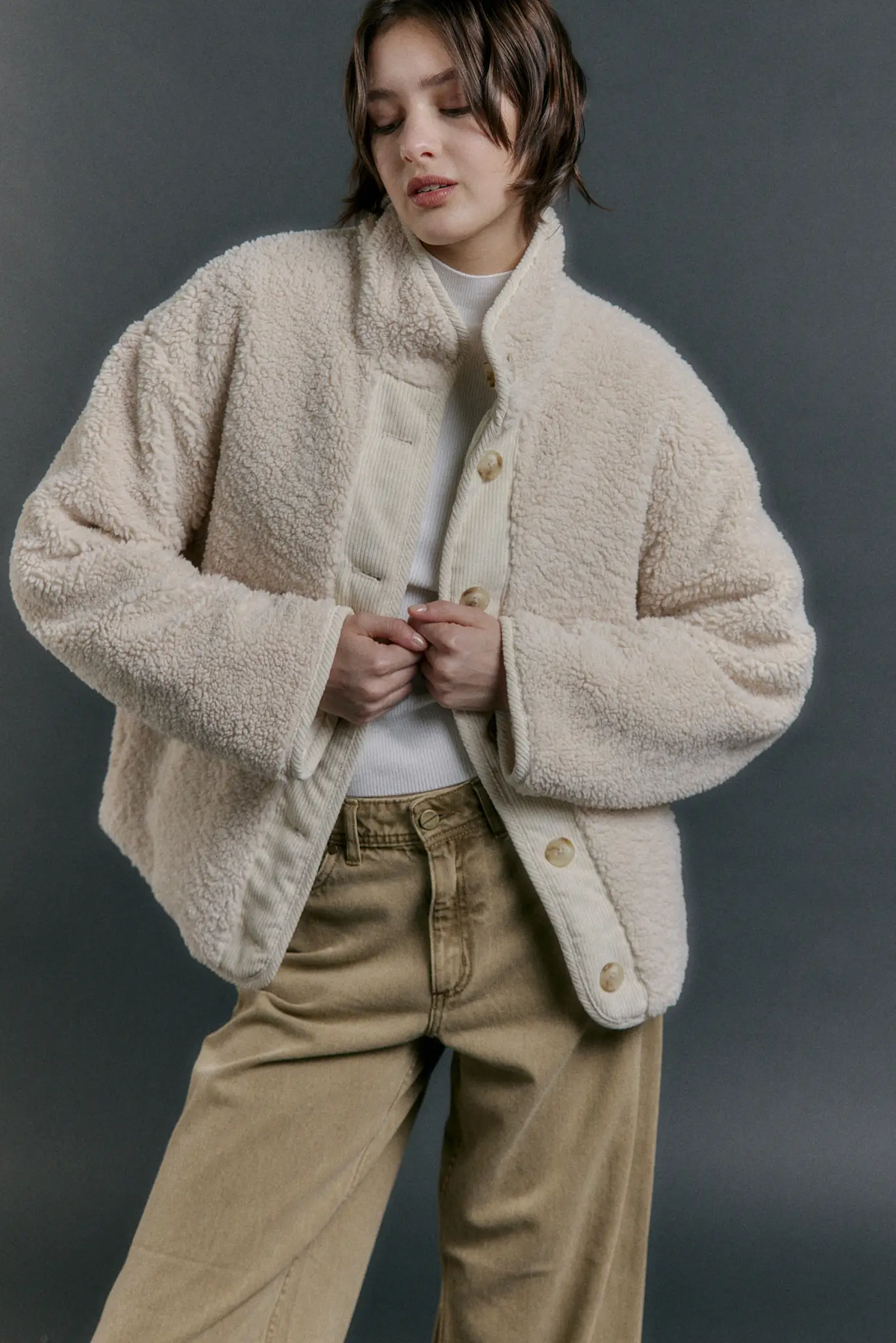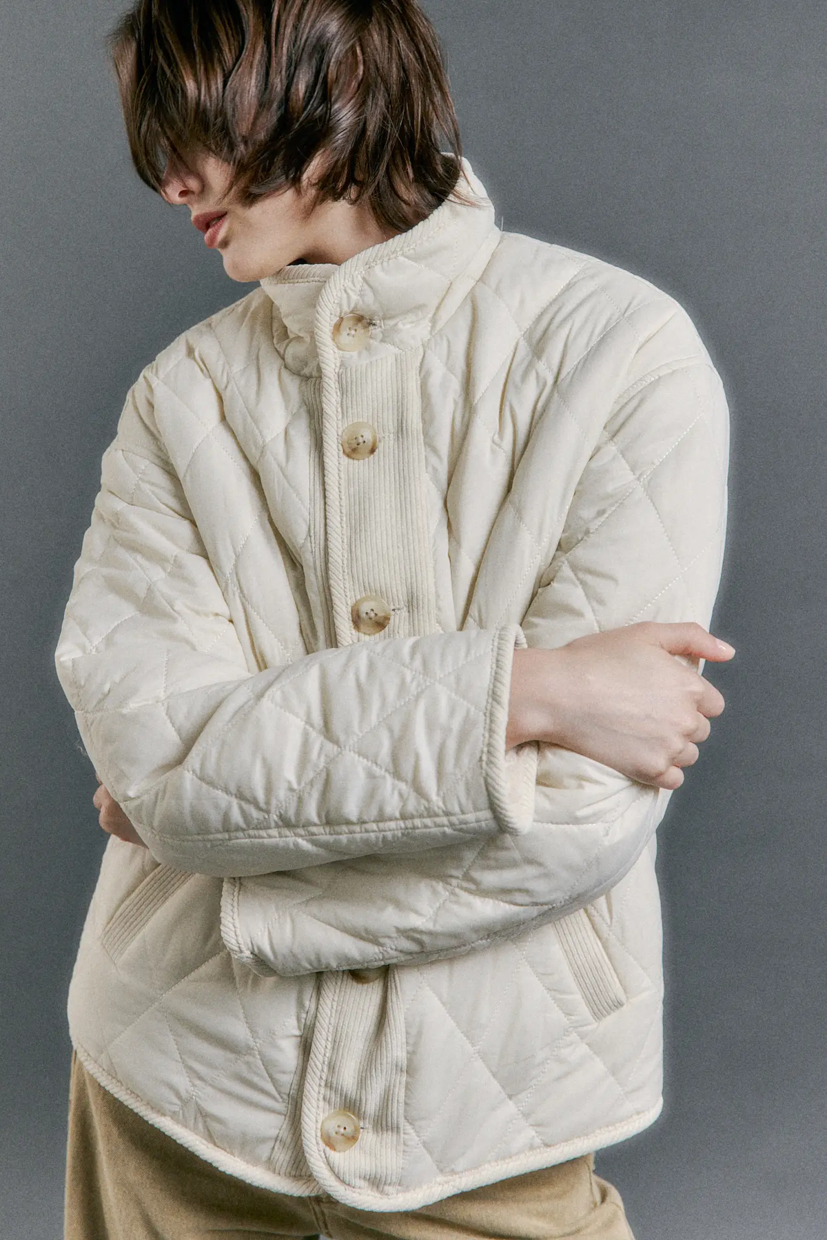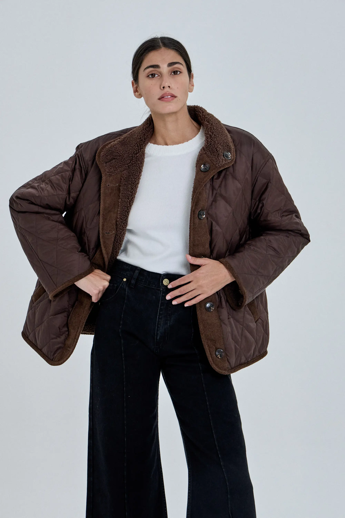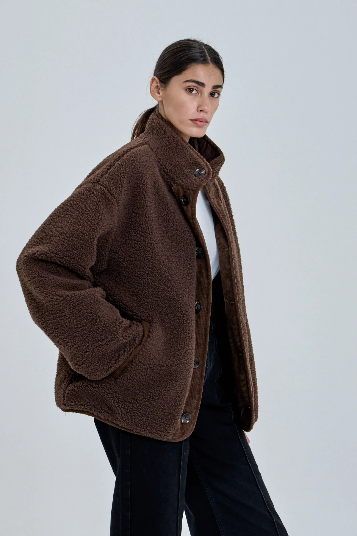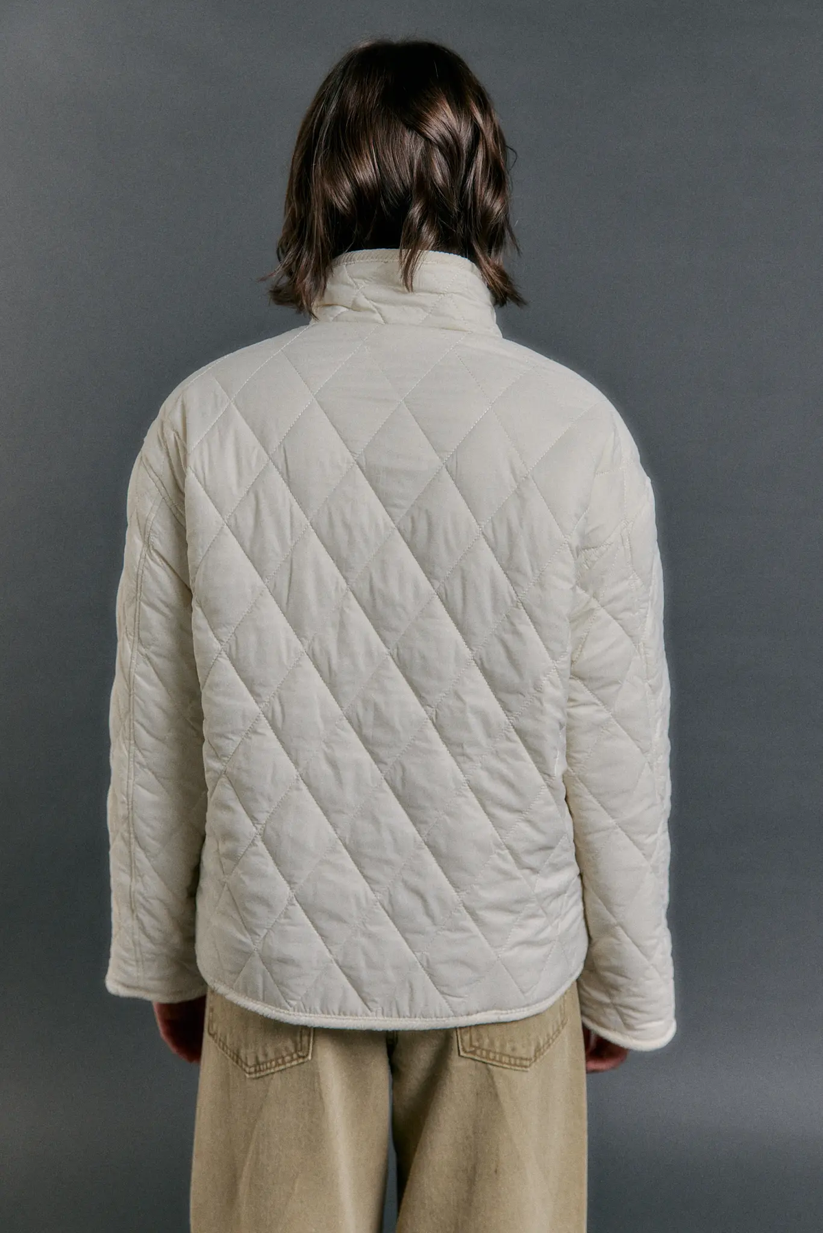 Campera reversible confeccionada en 100% nylon en el lado matelaseado y 100% poliéster en el lado de piel. Posee cuello alto y acceso mediante cartera con botones. Cuenta con bolsillos en ambos lados de la prenda.