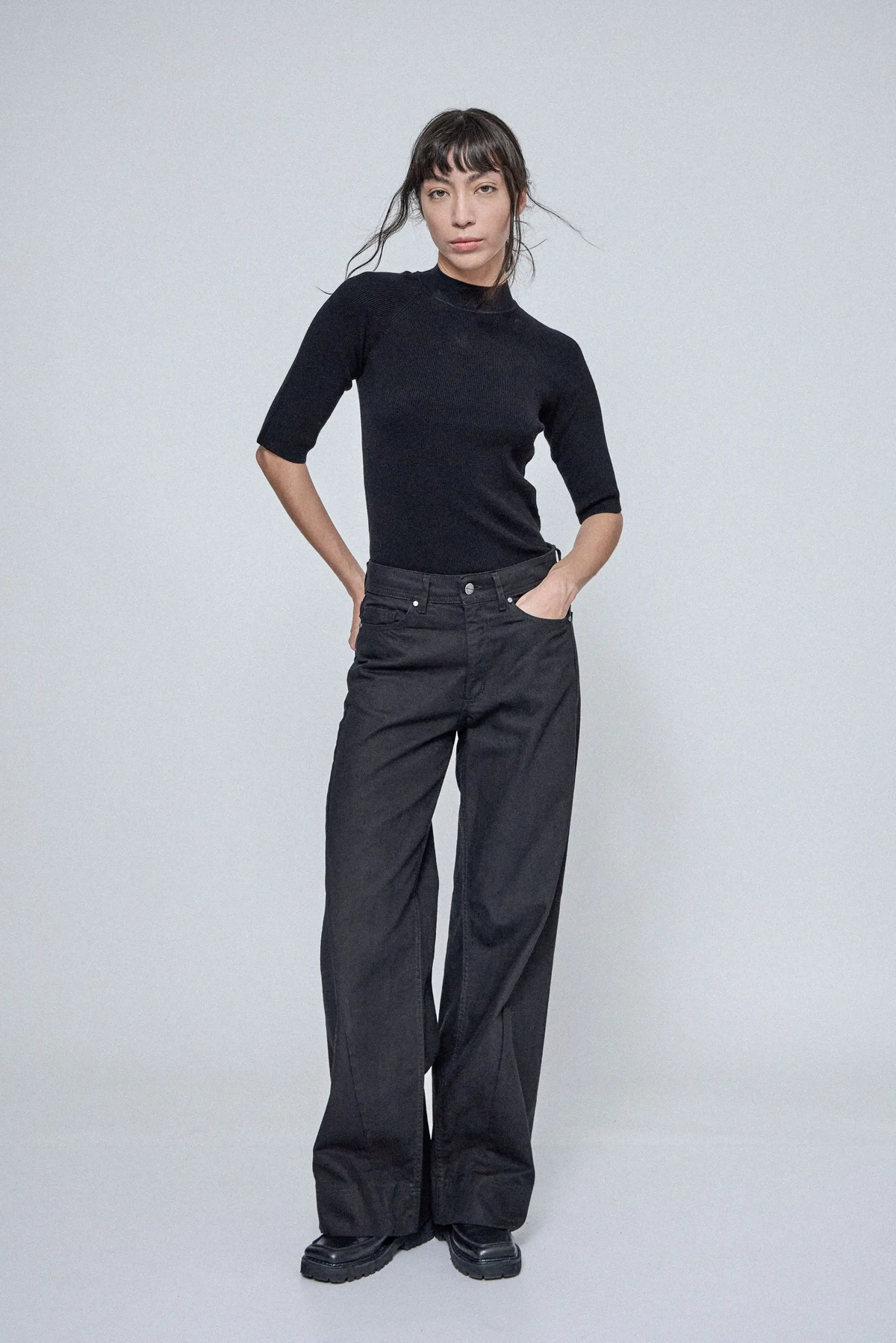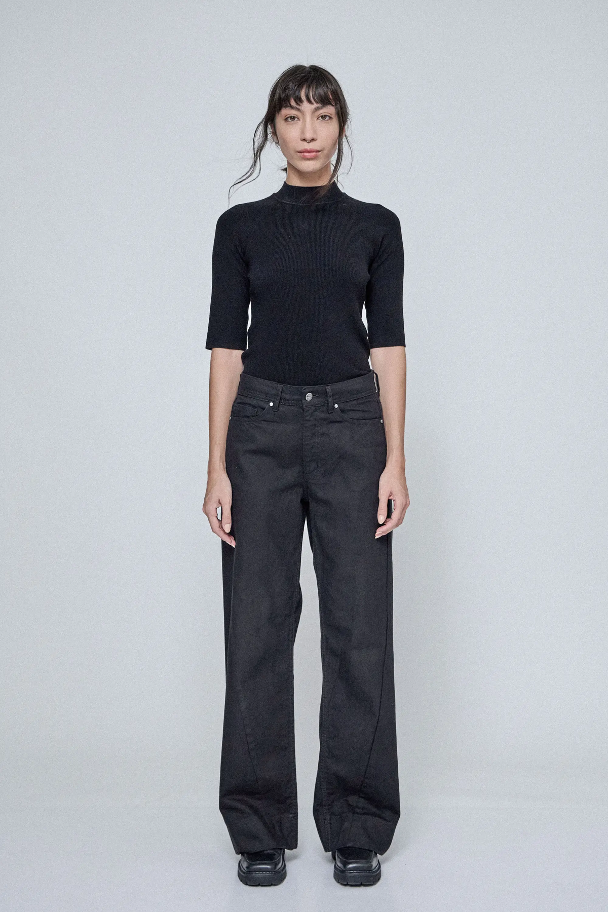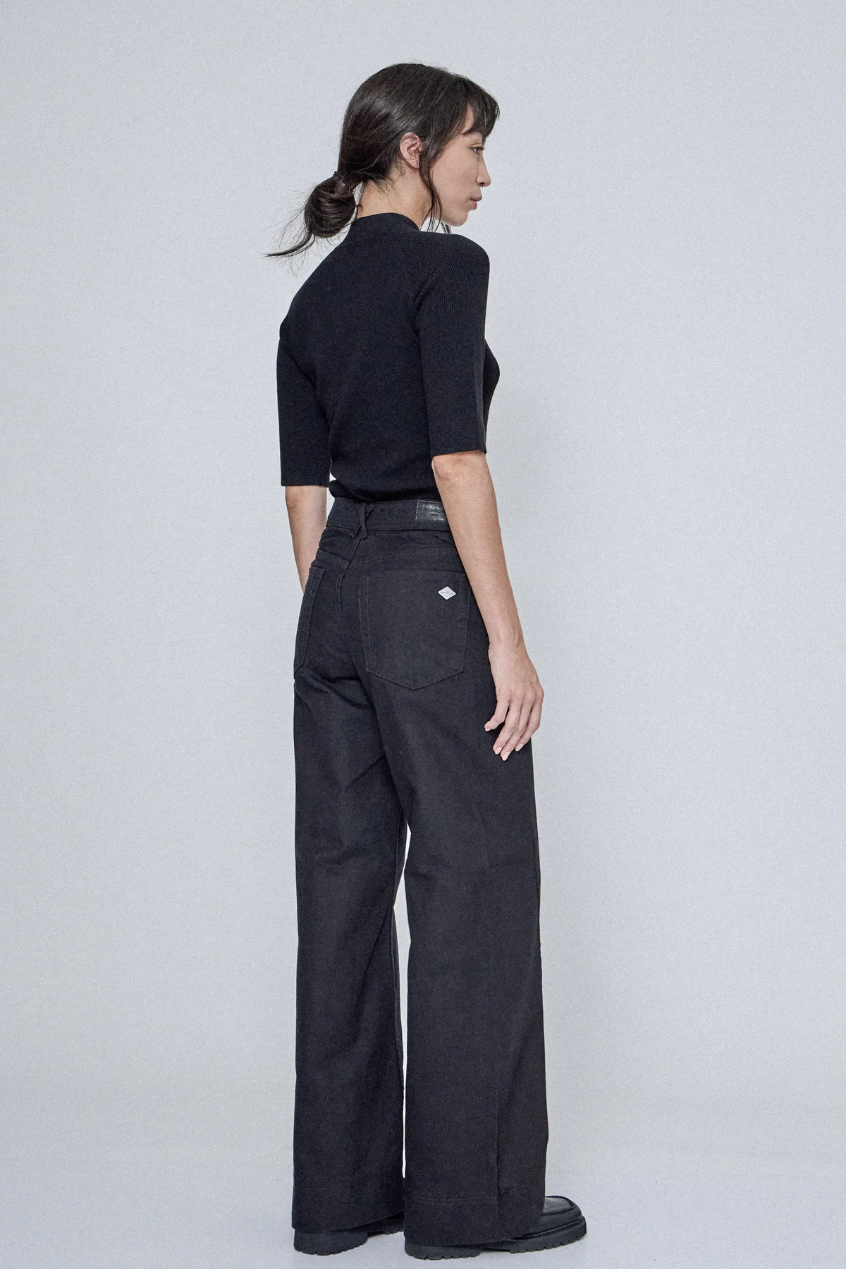 Jean tiro medio, 5 bolsillos, de calce wide leg. Confeccionado en denim 100 % algodón. Posee un recorte lateral que se avanza sobre el delantero a modo de detalle. Su lavado es estático y su color de hilo es negro al tono. En ruedo, posee detalle de ruedo ancho con pespunte doble y presilla cruzada en trasero.