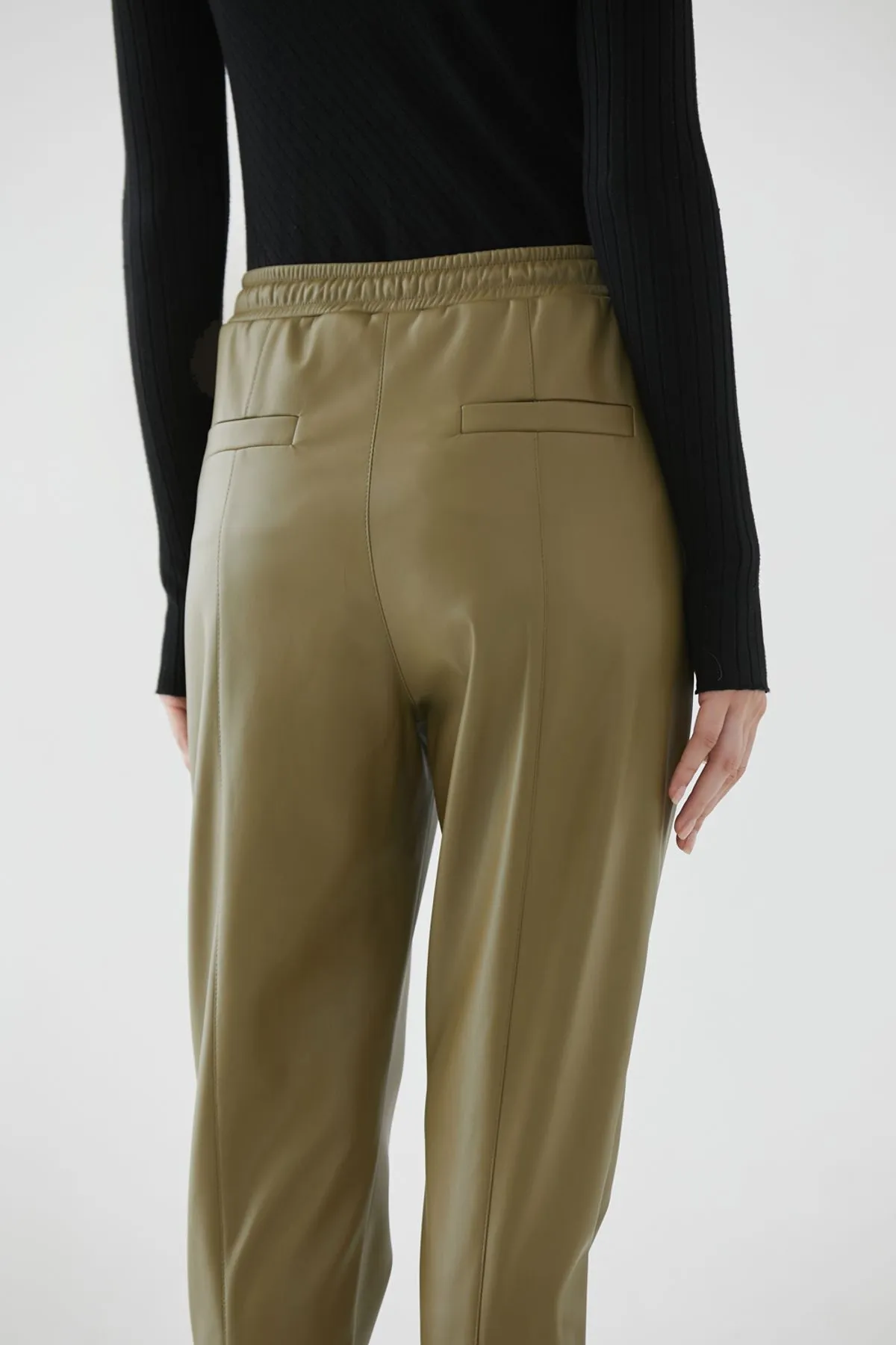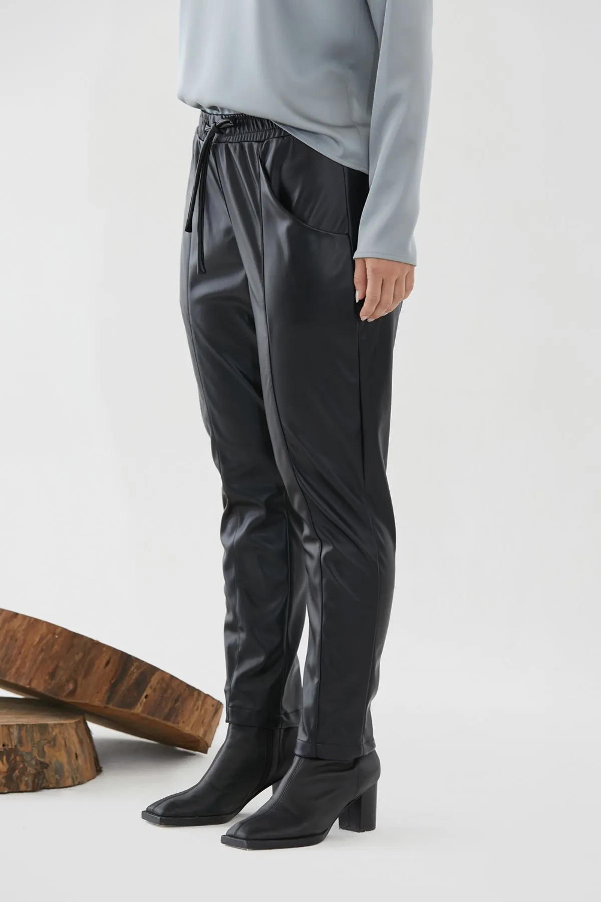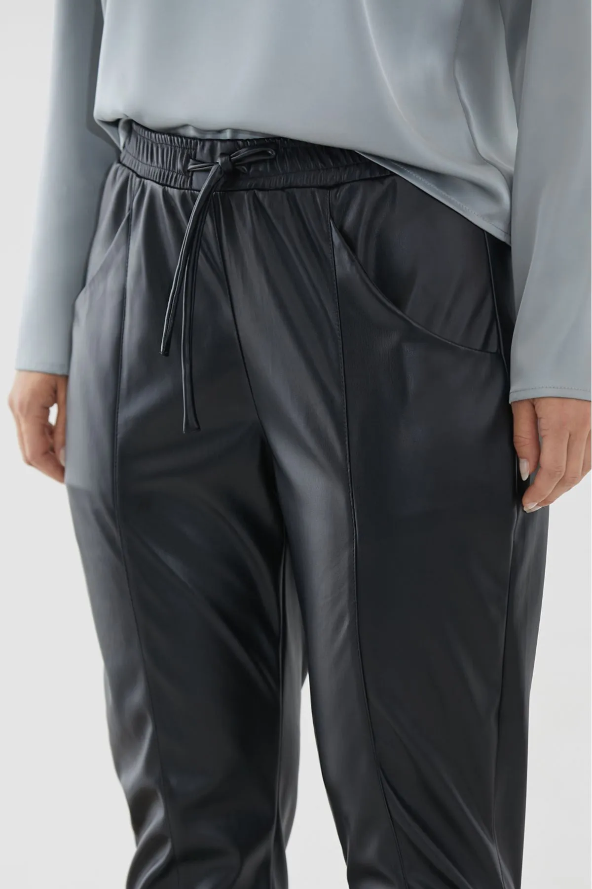 Pantalón jogger confeccionado en cuero ecológico. Cintura elastizada con tiras en misma tela y detalle de recortes verticales.