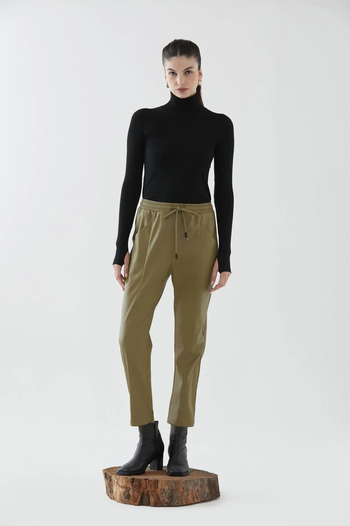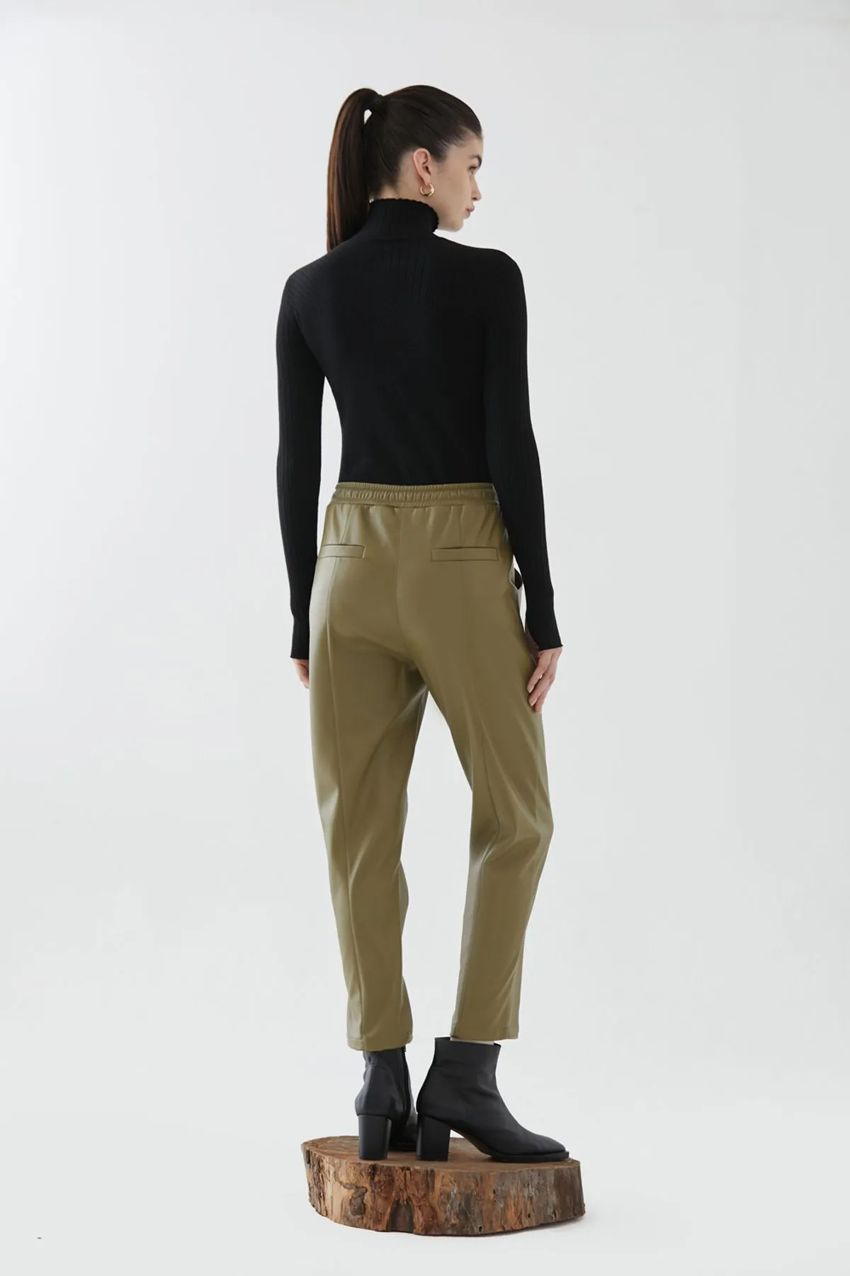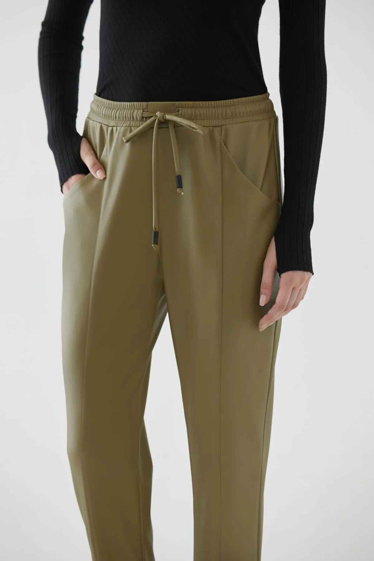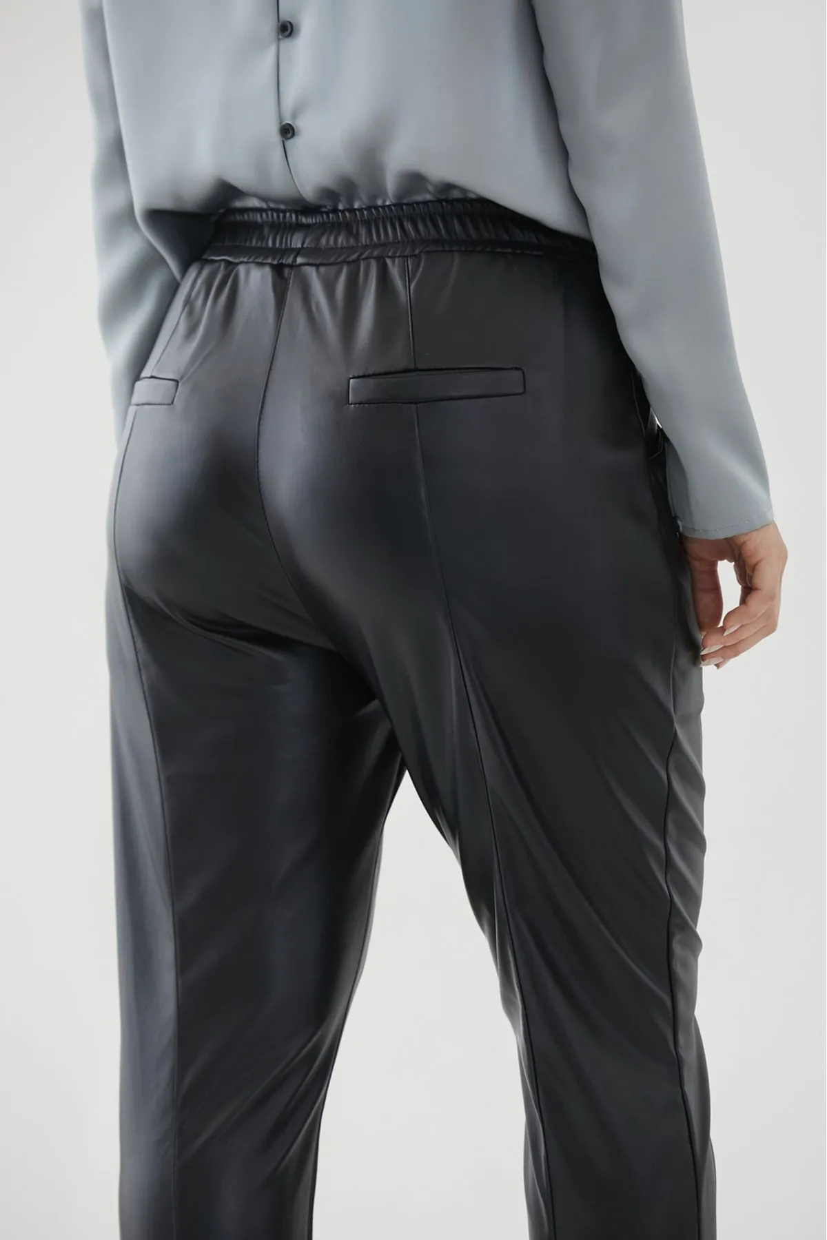 Pantalón jogger confeccionado en cuero ecológico. Cintura elastizada con tiras en misma tela y detalle de recortes verticales.
