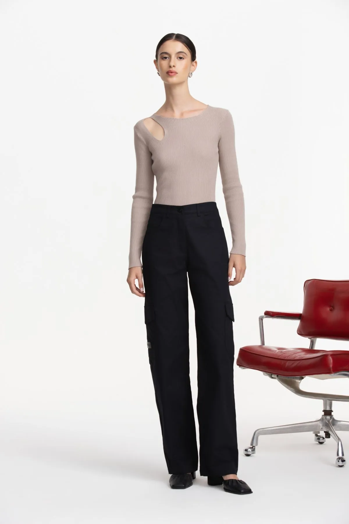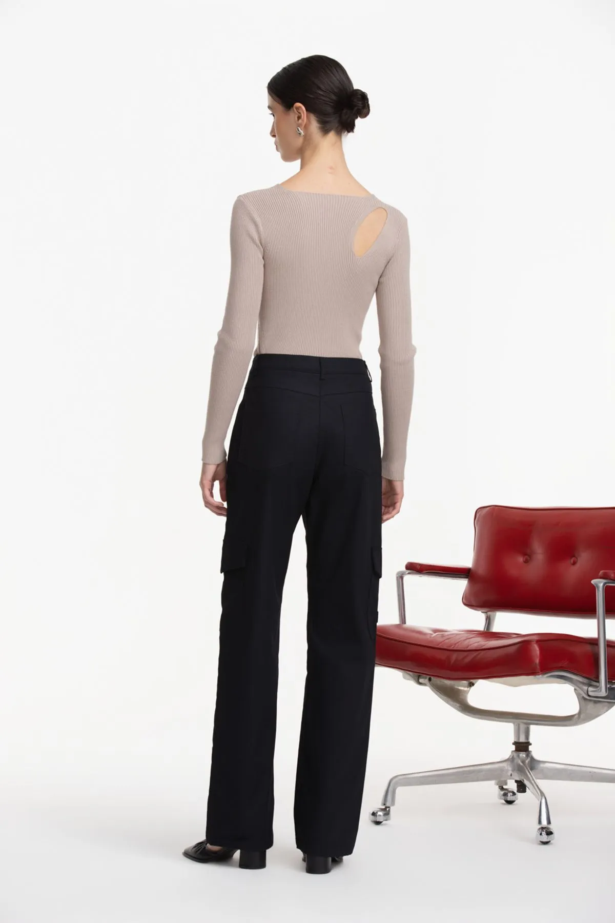 Detalles de multiples bolsillos con fuelle laterales y etiqueta de cuero gofrada