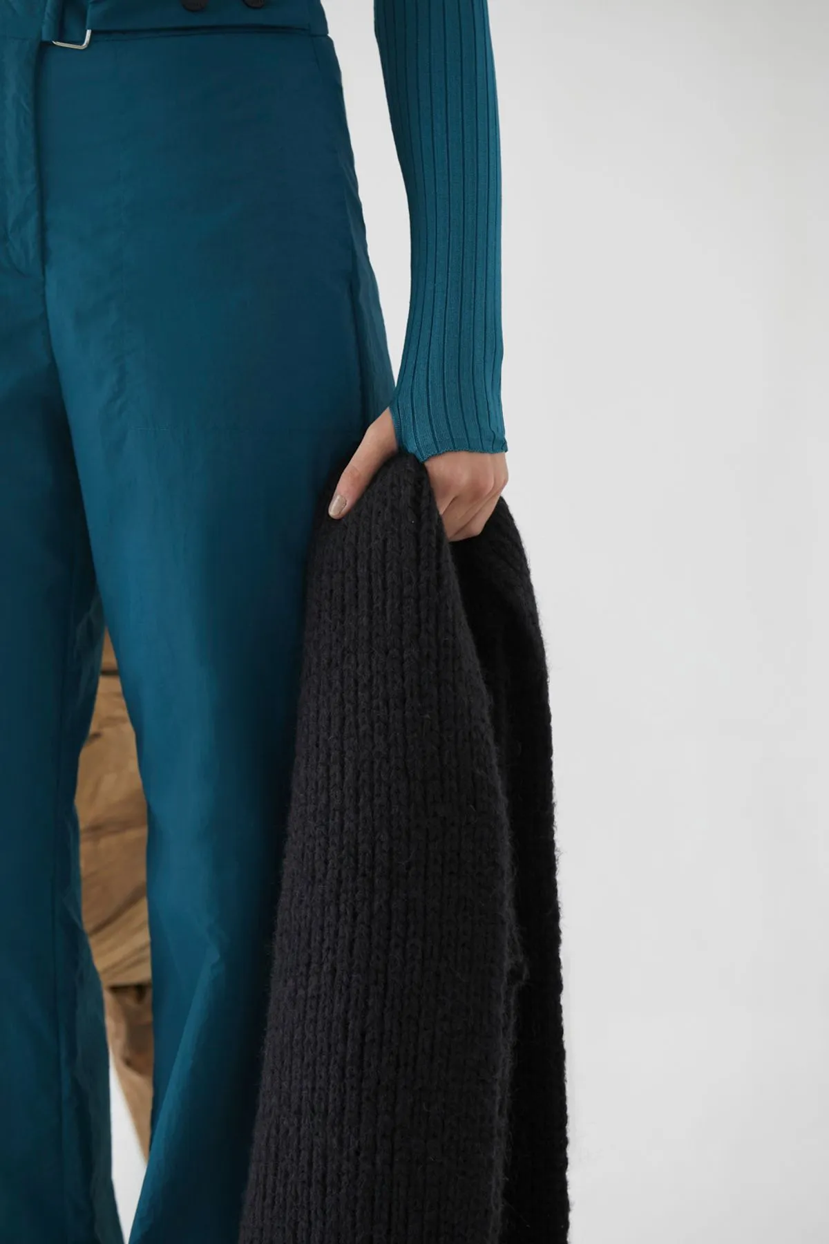 Polera punto morley diagonal tejida en rayon con spx. Detalle de abertura en puño.