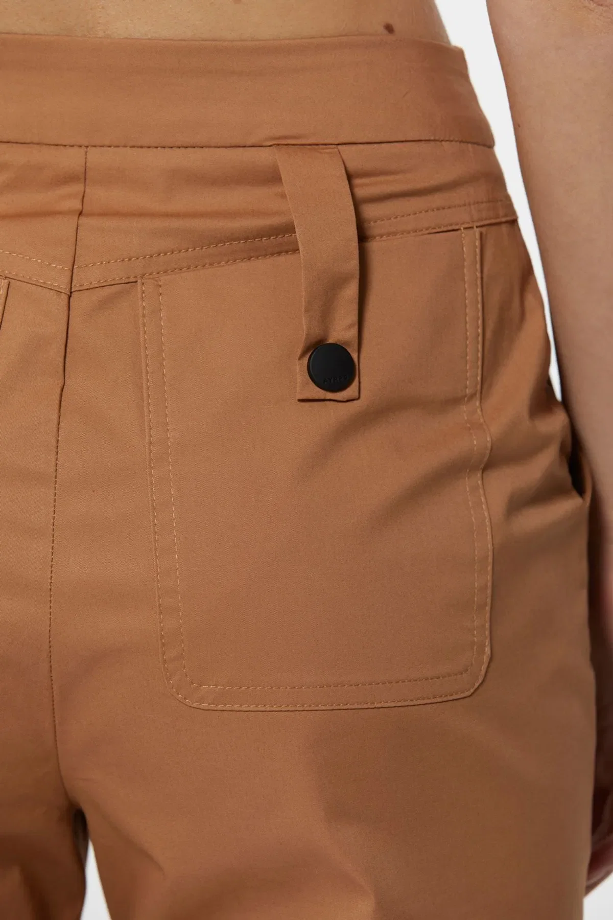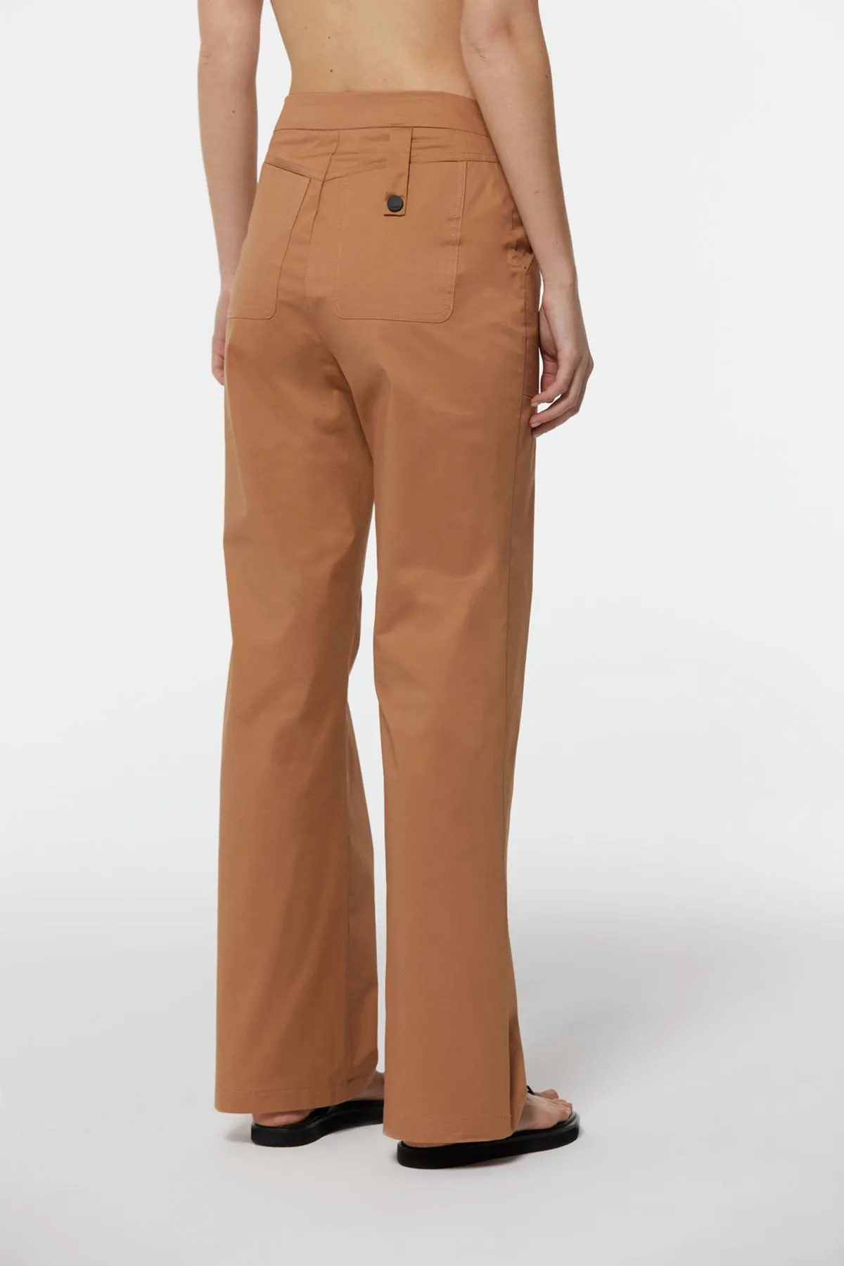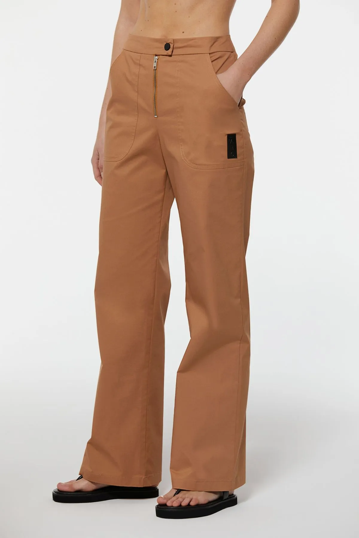 Pantalón recto confeccionado en gabardina liviana de algodón 100%. En delantero, detalles de cintura cruzada con broche soft touch personalizado, cierre metálico a la vista y bolsillos aplicados con etiqueta de goma pvc. En dorso, bolsillos aplicados con forma que siguen la línea del canesú y presilla con botón soft touch personalizado.