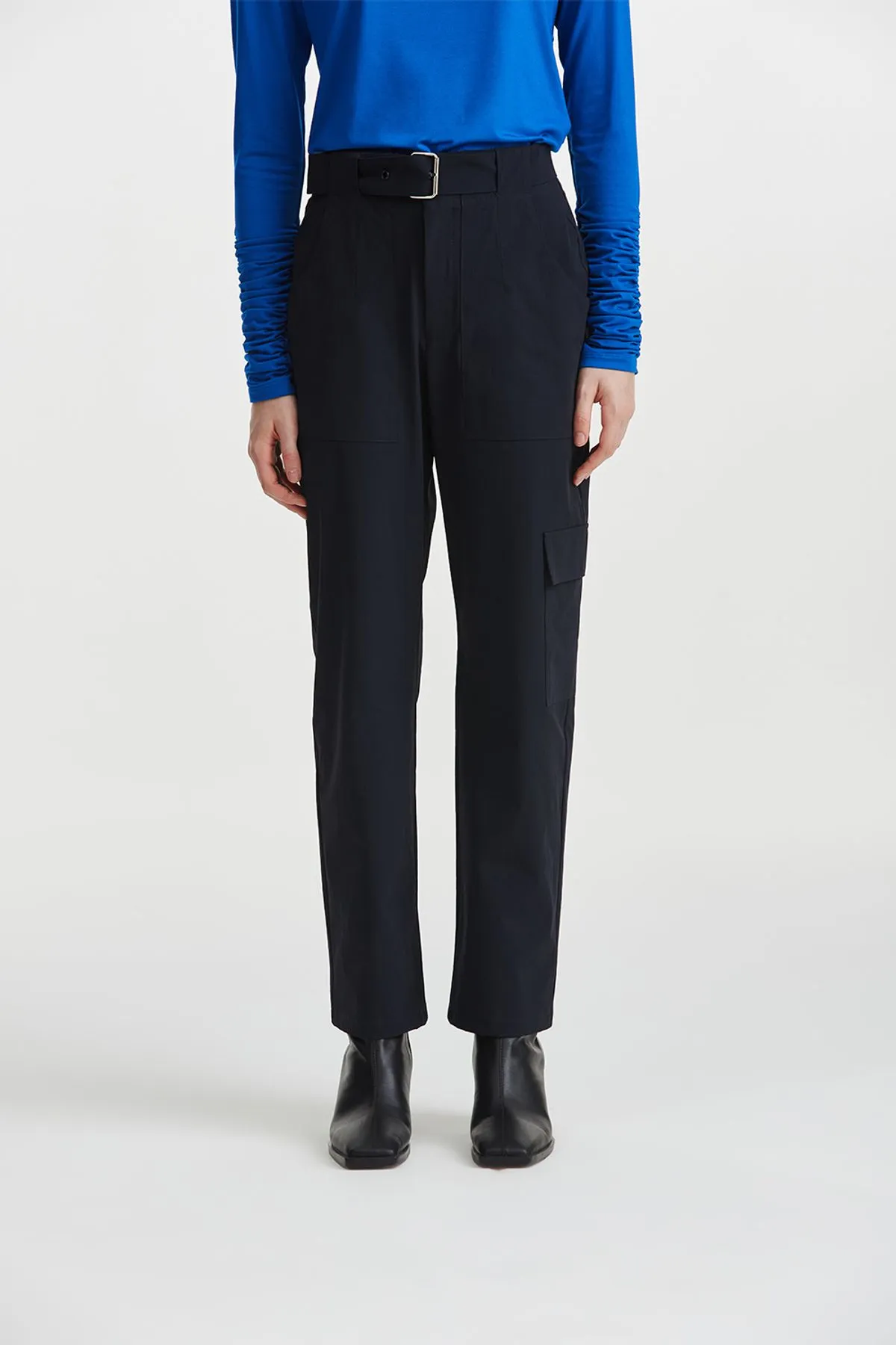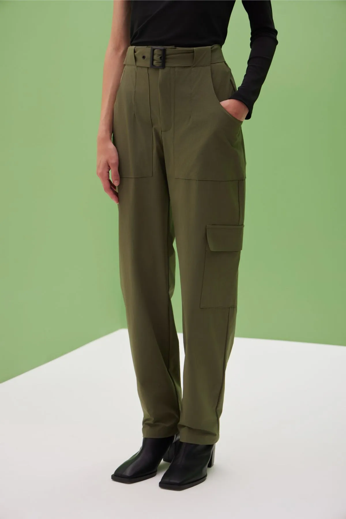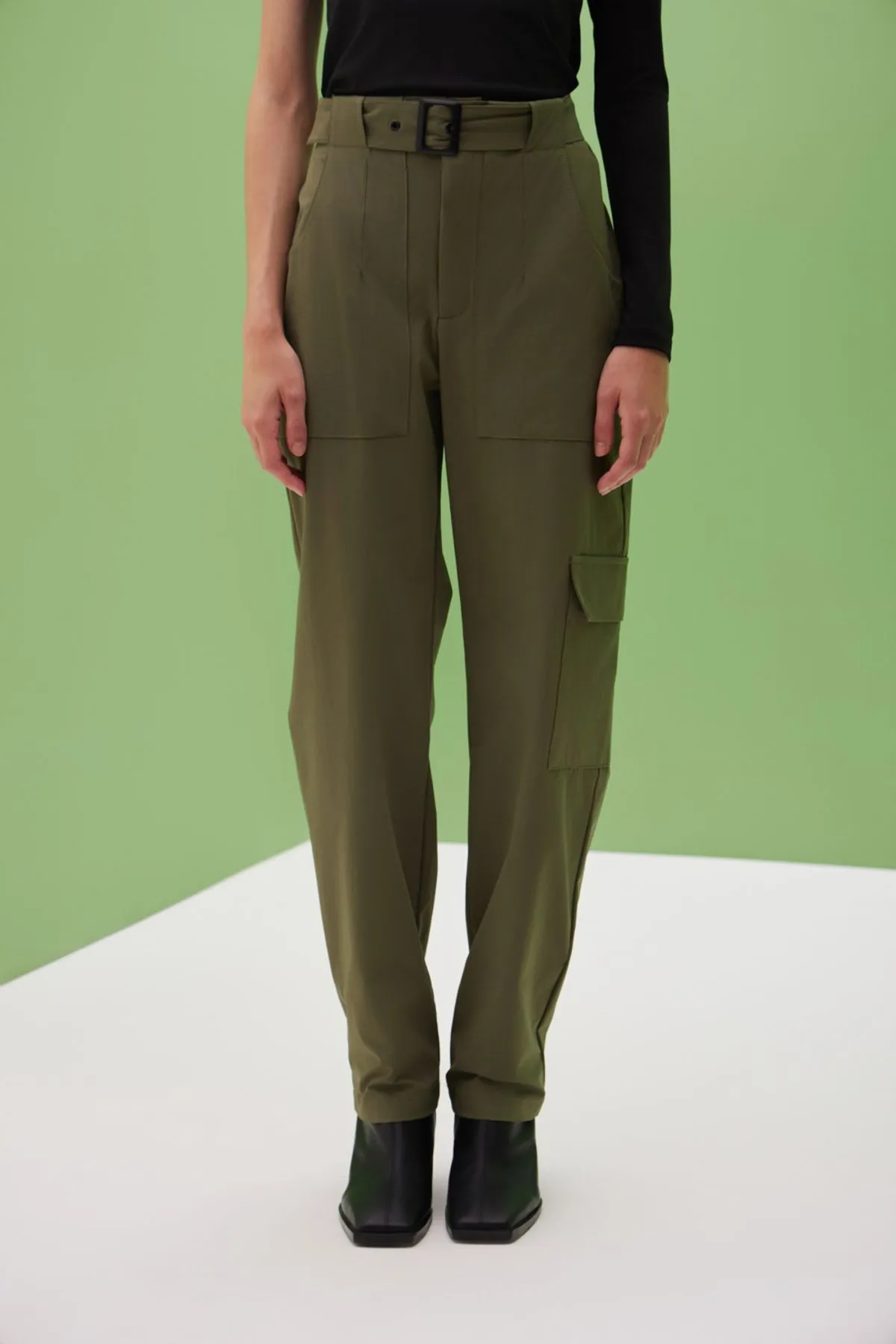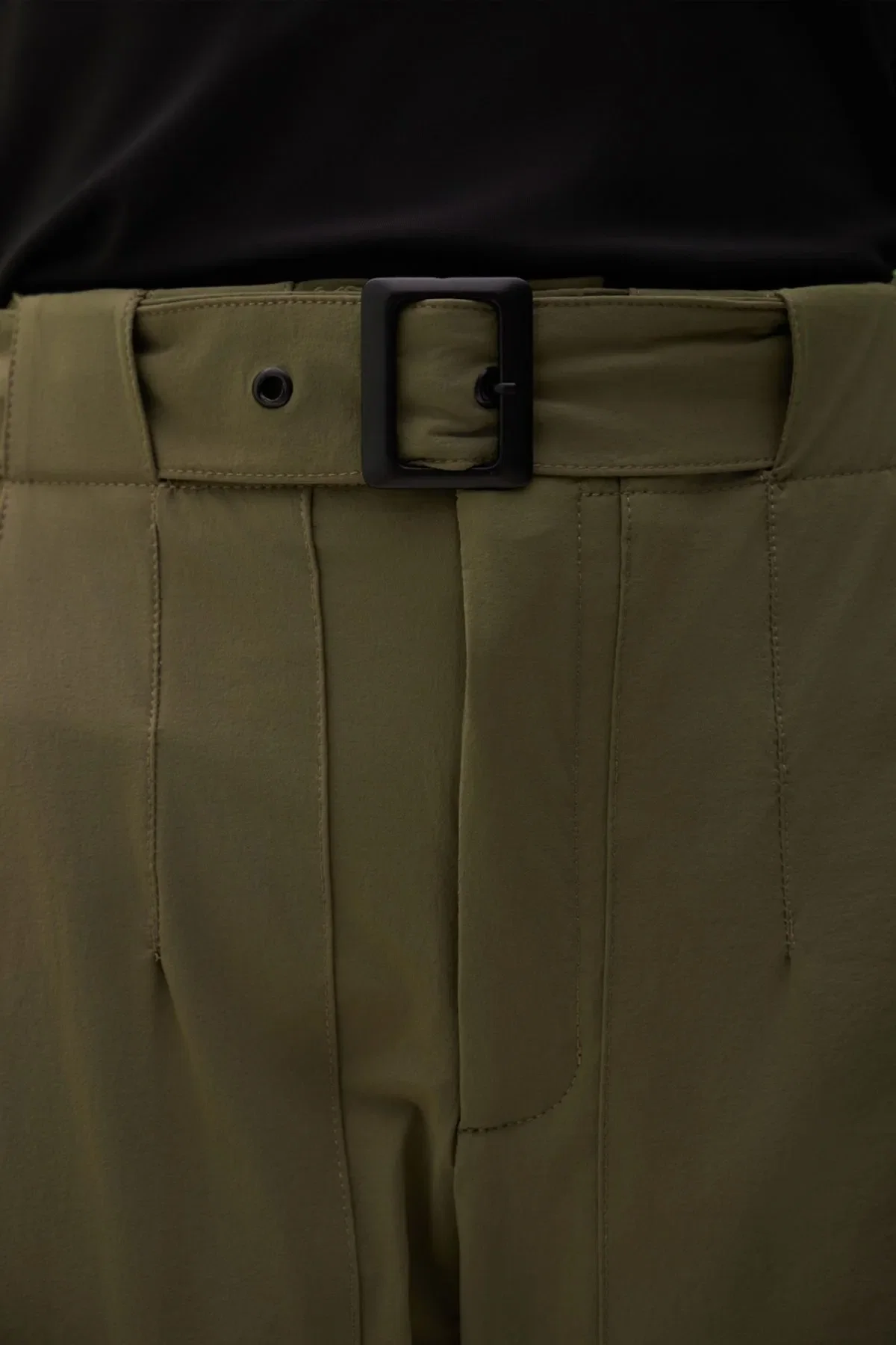 Pantalon confeccionado en textil de poliamida paper touch con spxDetalle de bolsillos cargo y cinturon en mismo textil con hebilla negra
