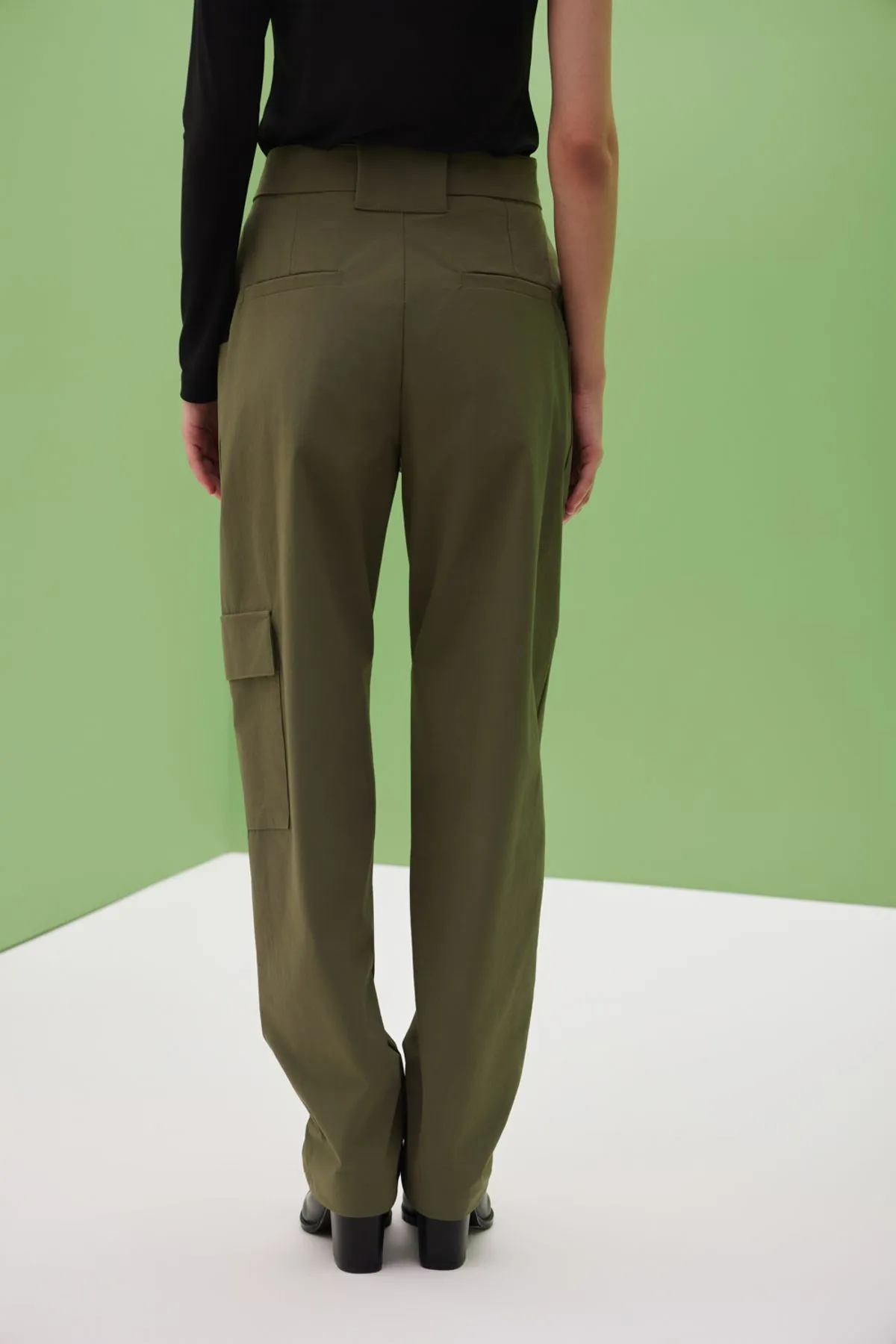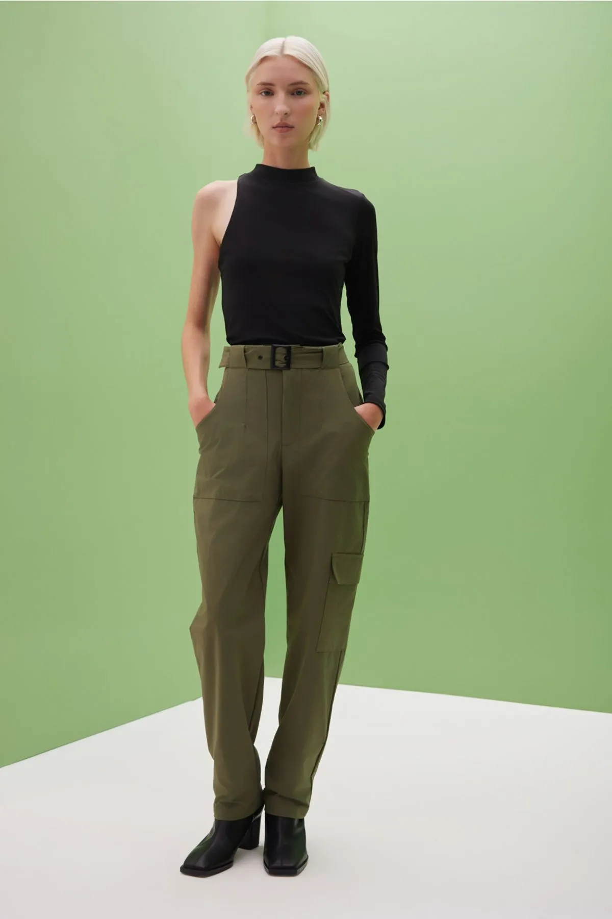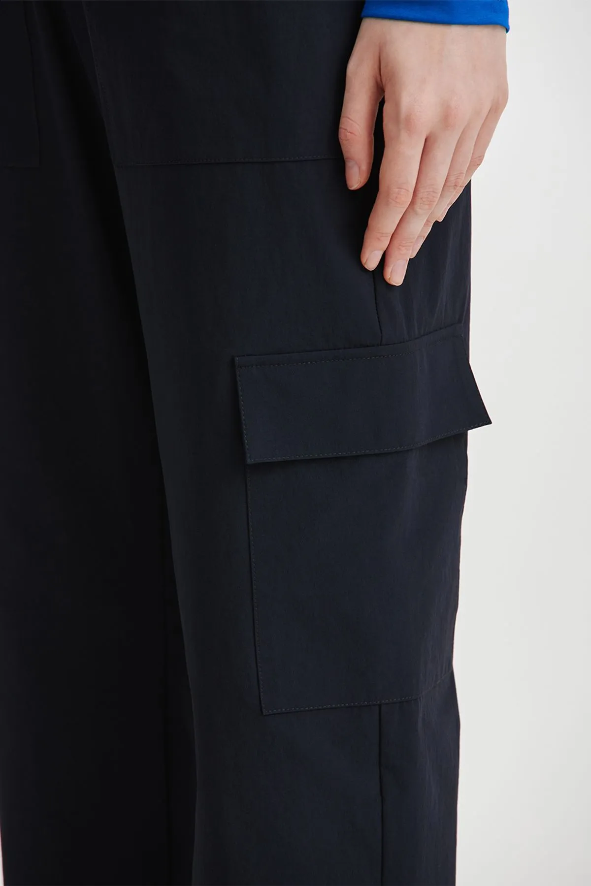 Pantalon confeccionado en textil de poliamida paper touch con spxDetalle de bolsillos cargo y cinturon en mismo textil con hebilla negra
