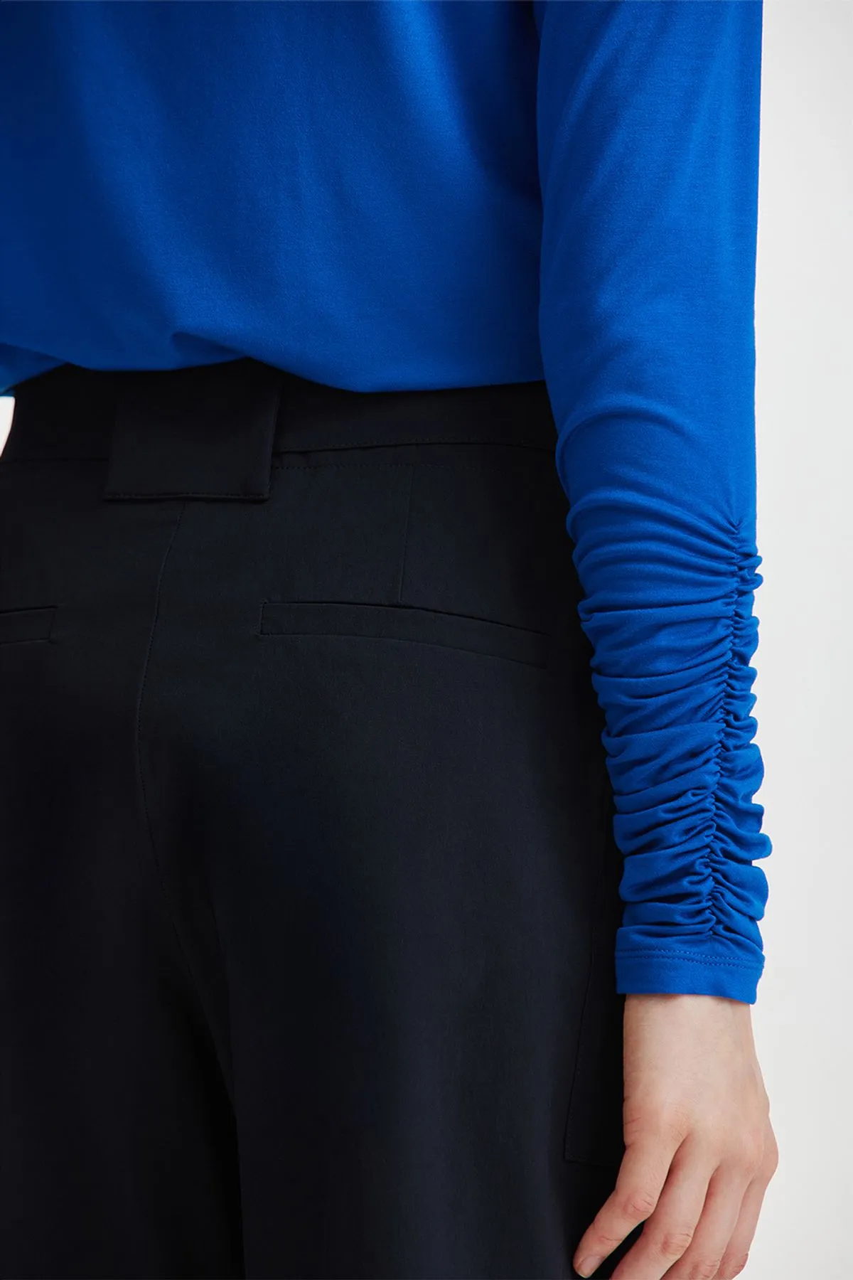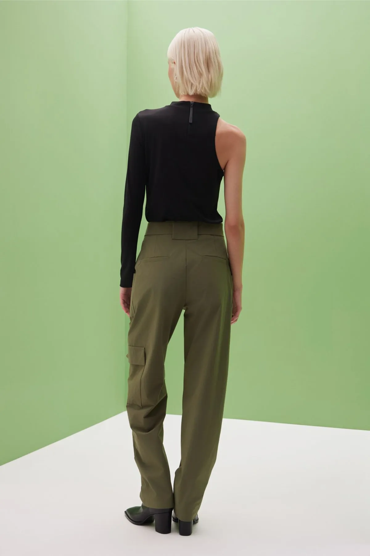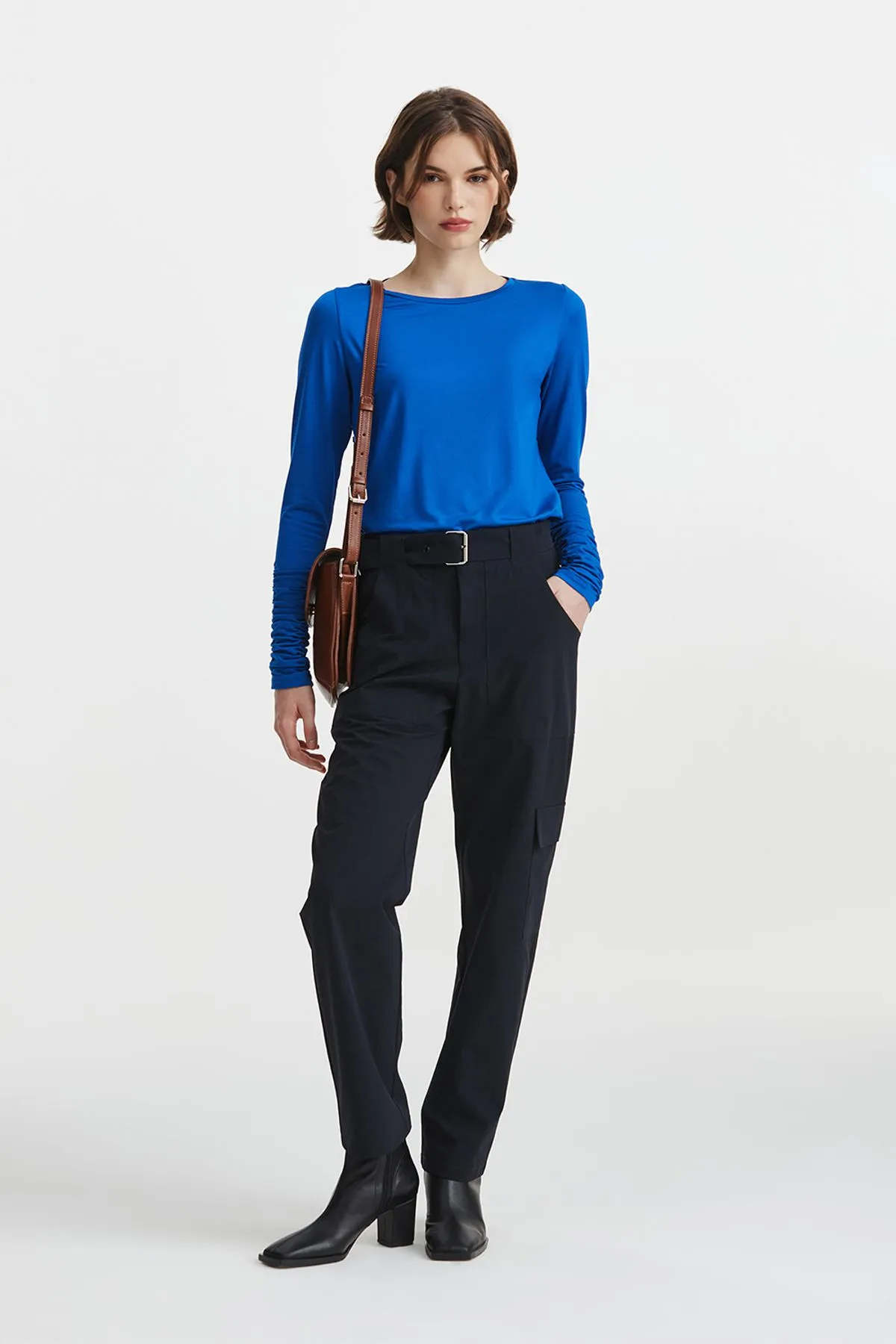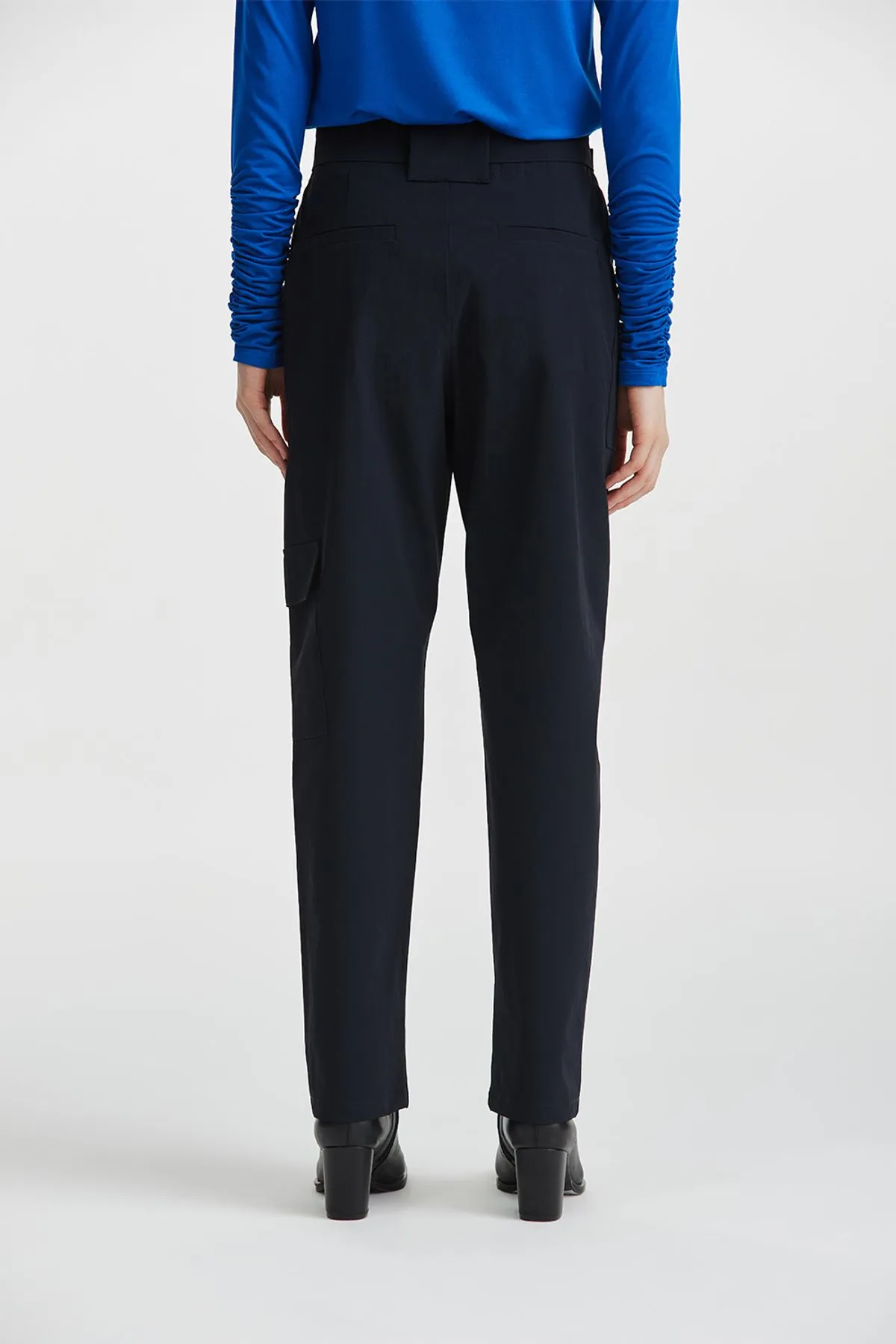 Pantalon confeccionado en textil de poliamida paper touch con spxDetalle de bolsillos cargo y cinturon en mismo textil con hebilla negra