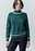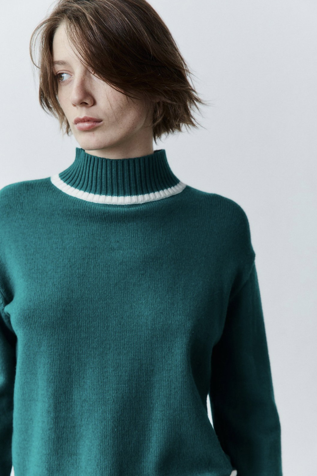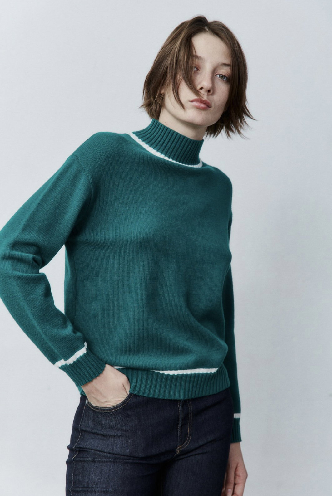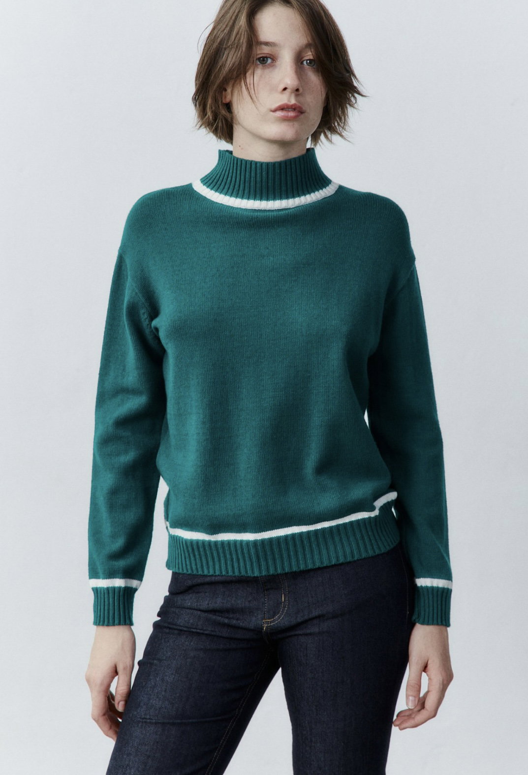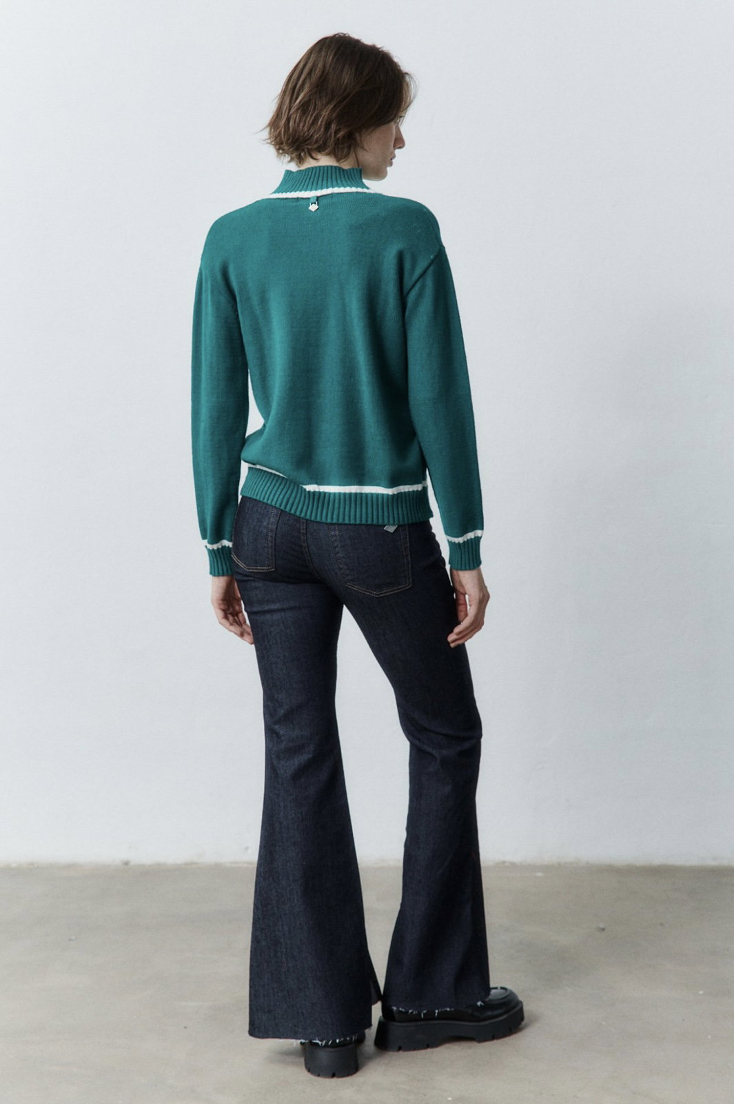Sweater corte clasico con vivo a contratono. Tejido en hilado de 42% viscosa, 34% poliamida y 24% poliester. El modelo viene en 3 variantes: crudo con azul, negro con off crudo y verde con crudo. El largo total de hombro a ruedo es de 59 cm en talle 2.