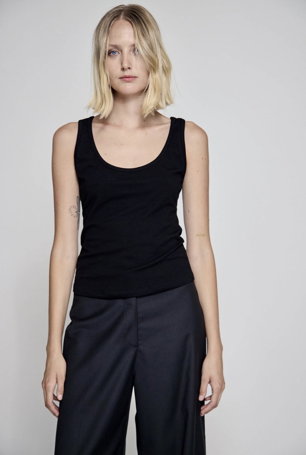 Remera confeccionada con género de punto 94% algodón 6% spandex. De silueta ultra slim, es una prenda que se adhiere al cuerpo. Musculosa, de escote redondeado y breteles anchos, con espalda alta. Pertenece a la linea de