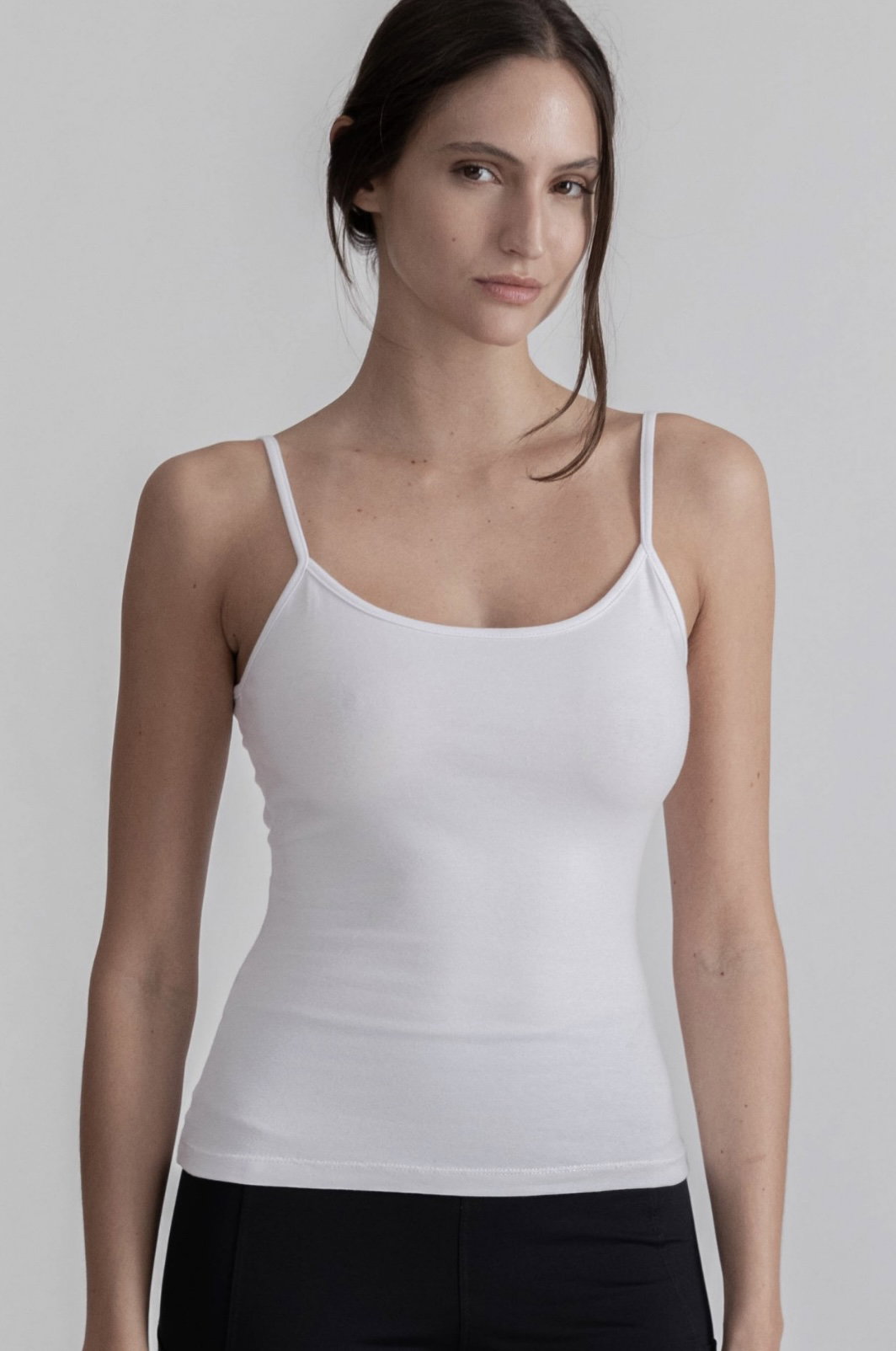 Remera confeccionada con género de punto 94% algodón 6% spandex. De silueta ultra slim, es una prenda que se adhiere al cuerpo. Escote redondeado y breteles finos. Ideal para utilizar debajo de otras piezas, como primera piel. Pertenece a nuestra linea de básicos que se repiten todas las temporadas.