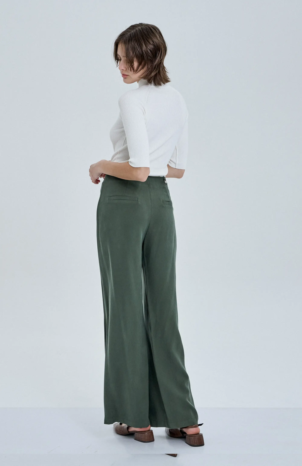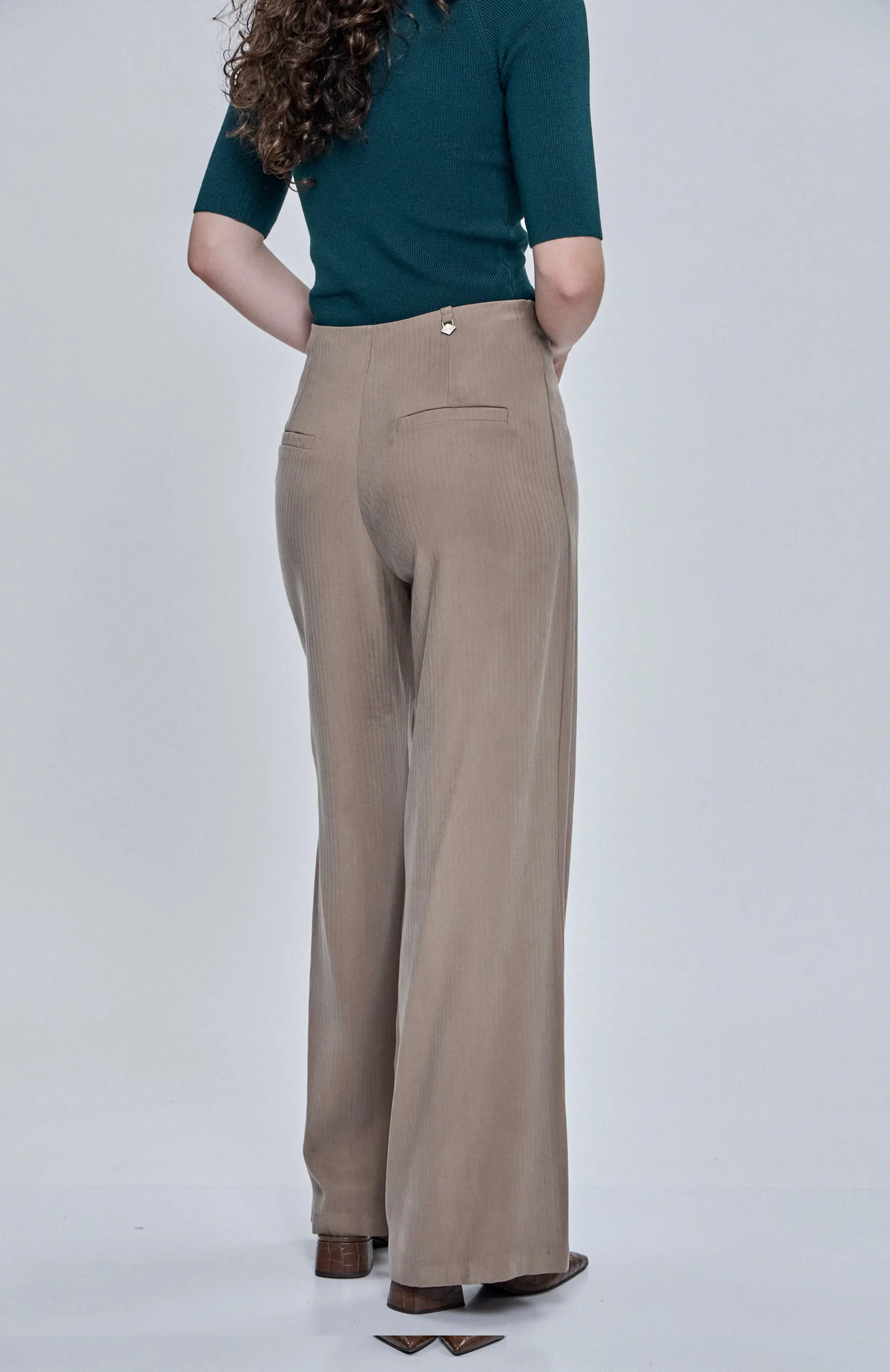 Pantalón sastrero tiro alto, palazzo, con cintura incorporada. Confeccionado en