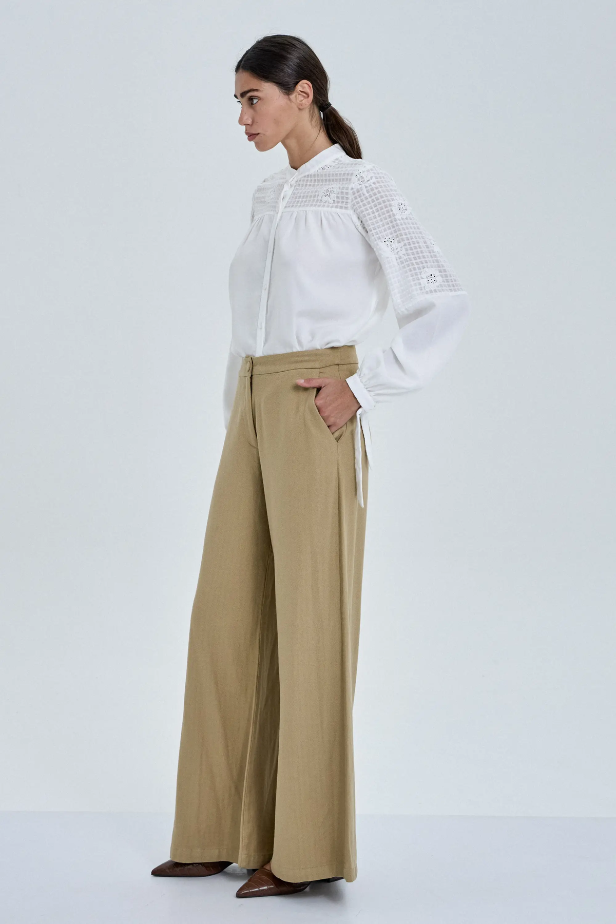 Pantalón sastrero de tiro medio y calce wide leg. Confeccionado en un tejido