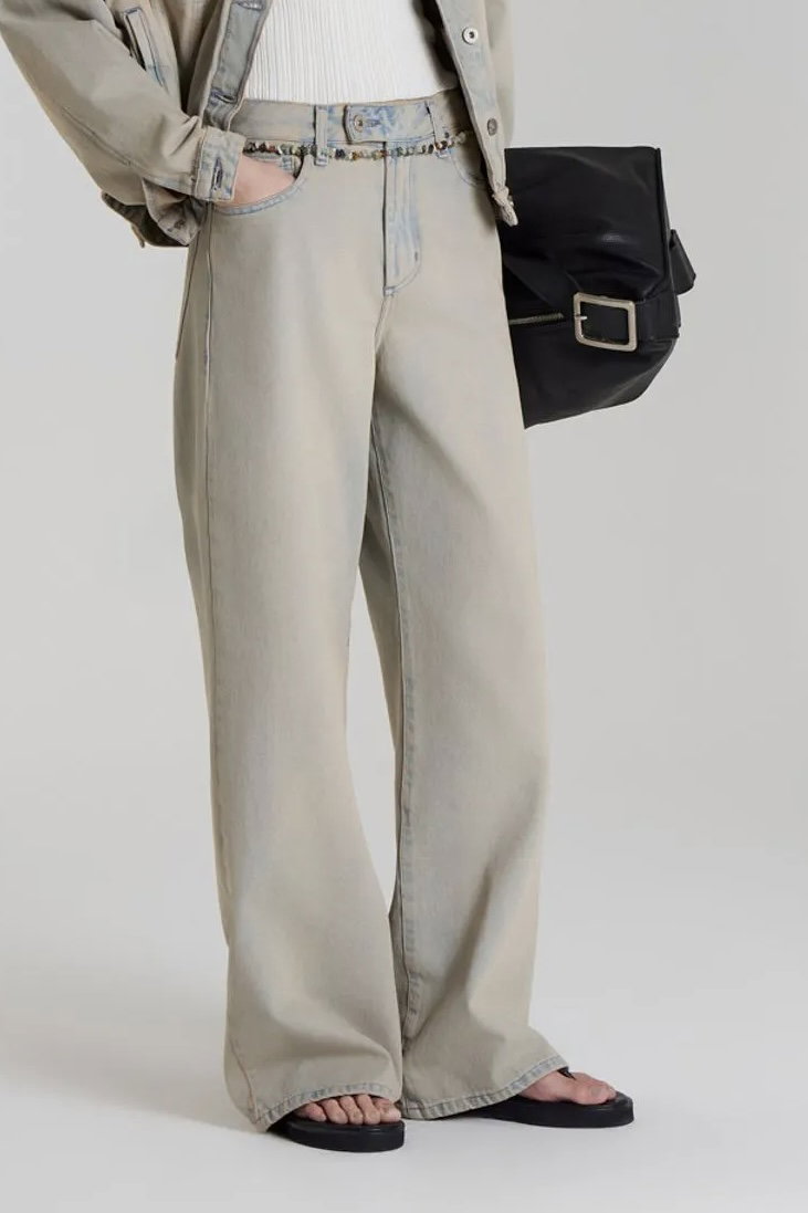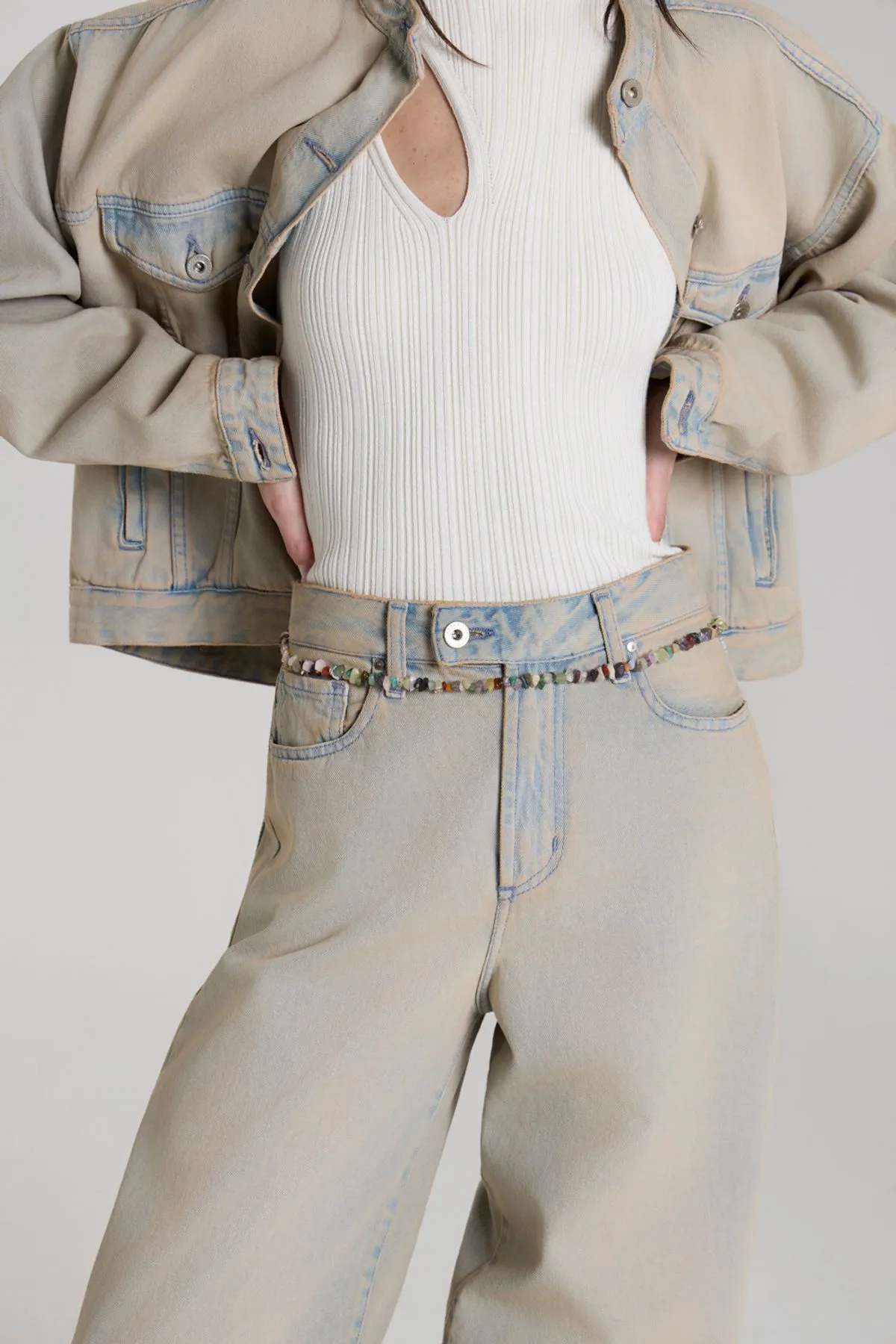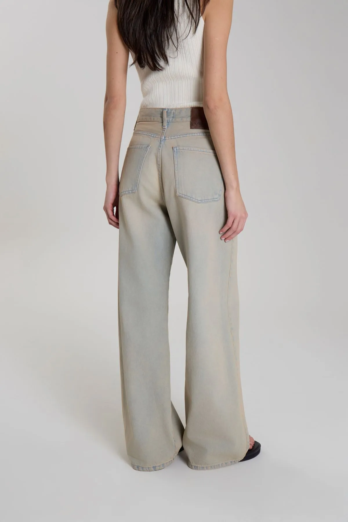 Wideleg confeccionado en denim 100% algodón con proceso de matizado color beige. Detalle de cintura desfasada y avios color cobre. Badana color chocolate.