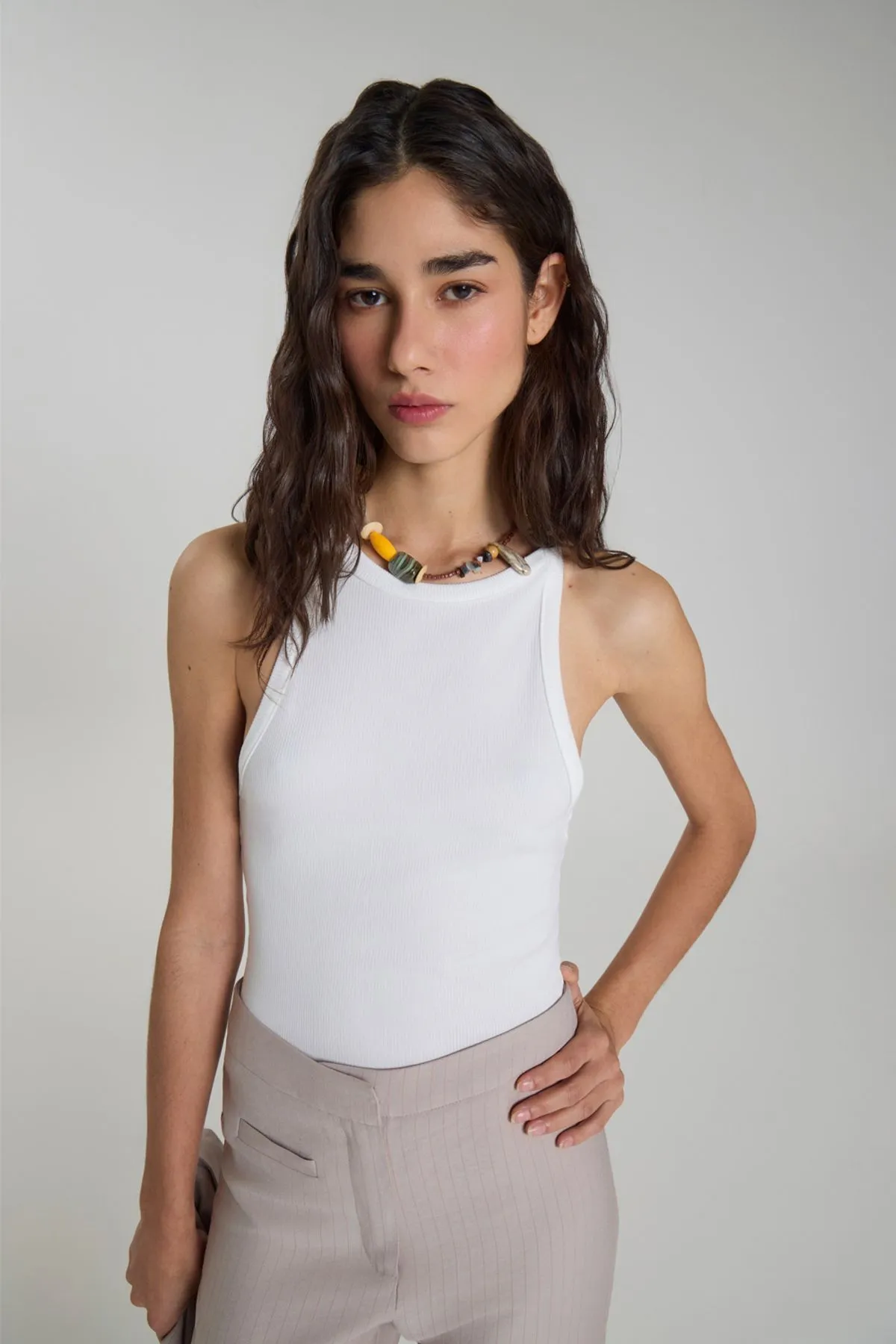 Musculosa confeccionada en morley con escote halter y breteles anudados en espalda.