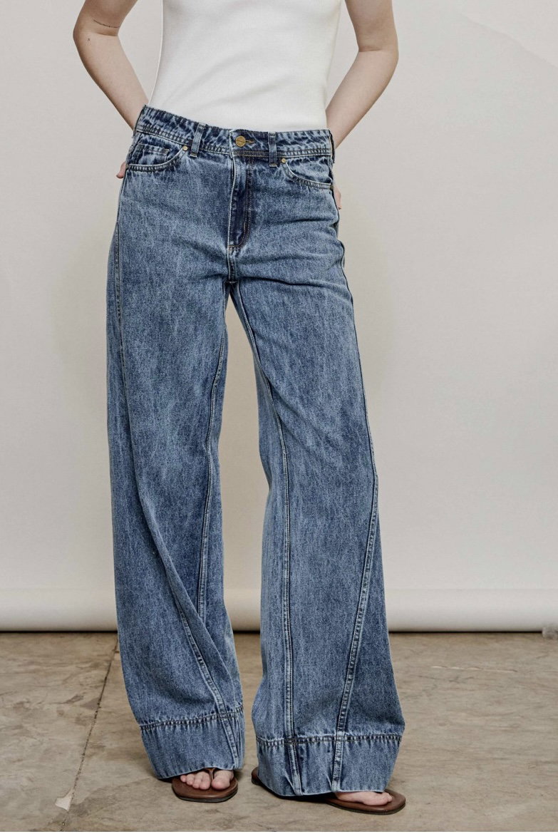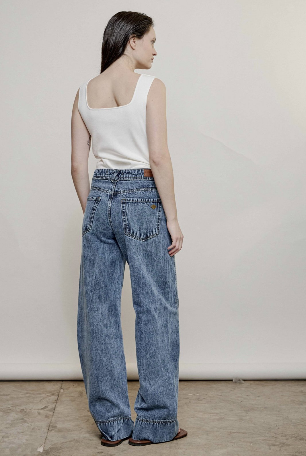 Jean tiro medio 5 bolsillos de calce wide leg. Confeccionado