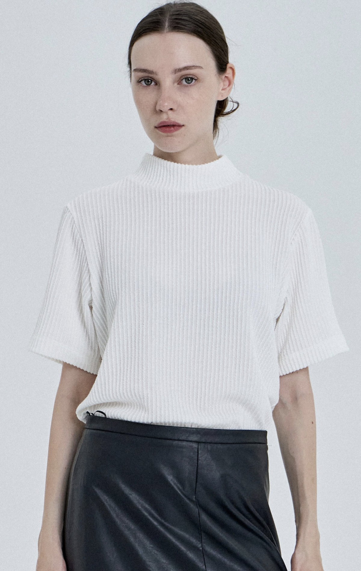 un cuello media polera y mangas cortas amplias. La tela es tramada, cuenta