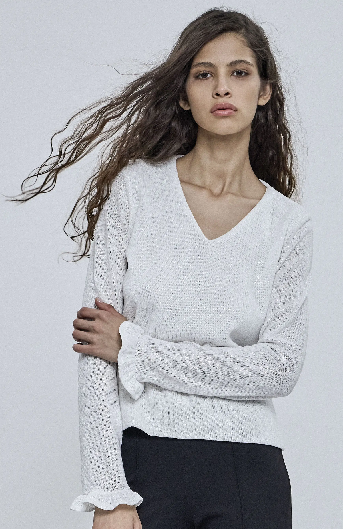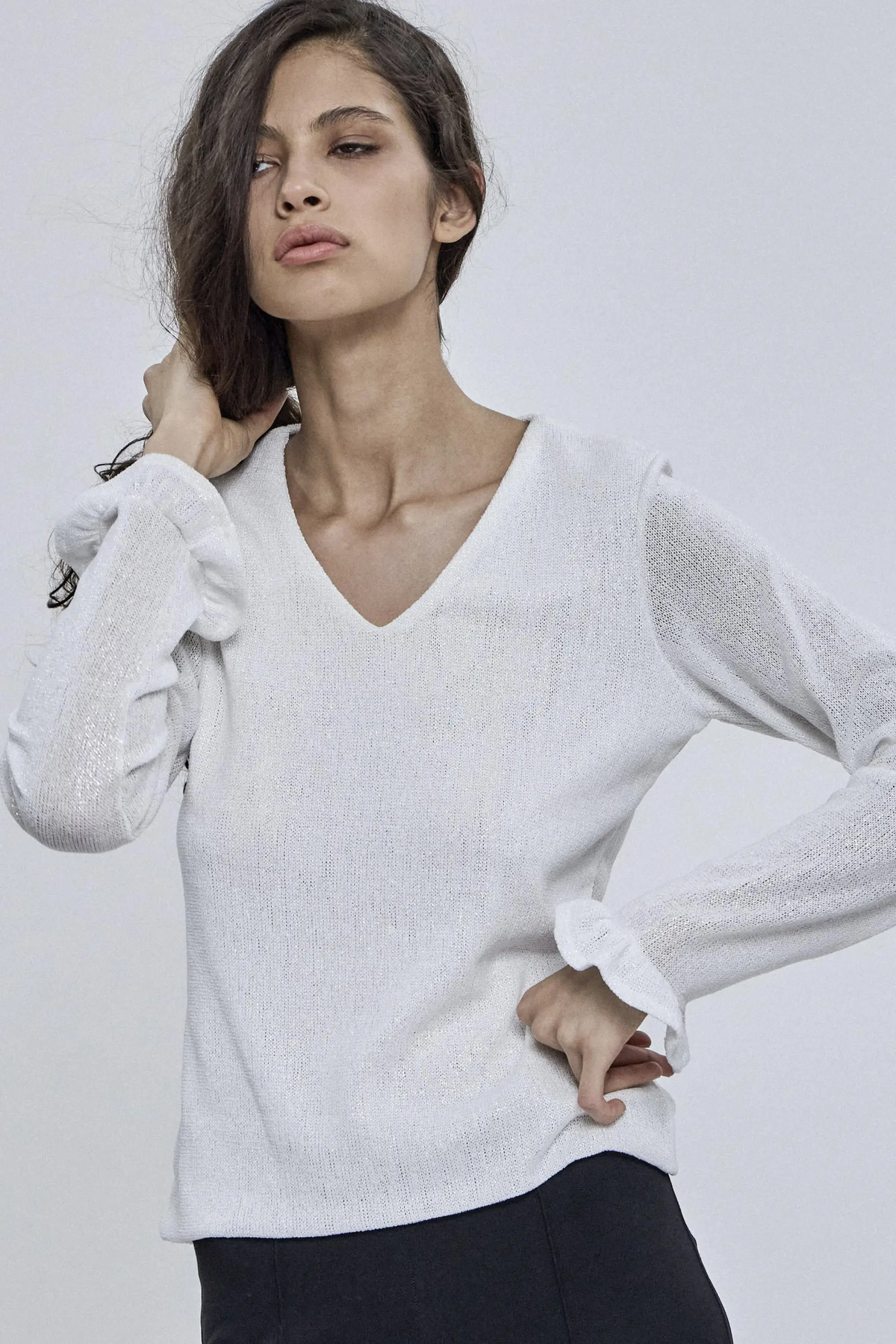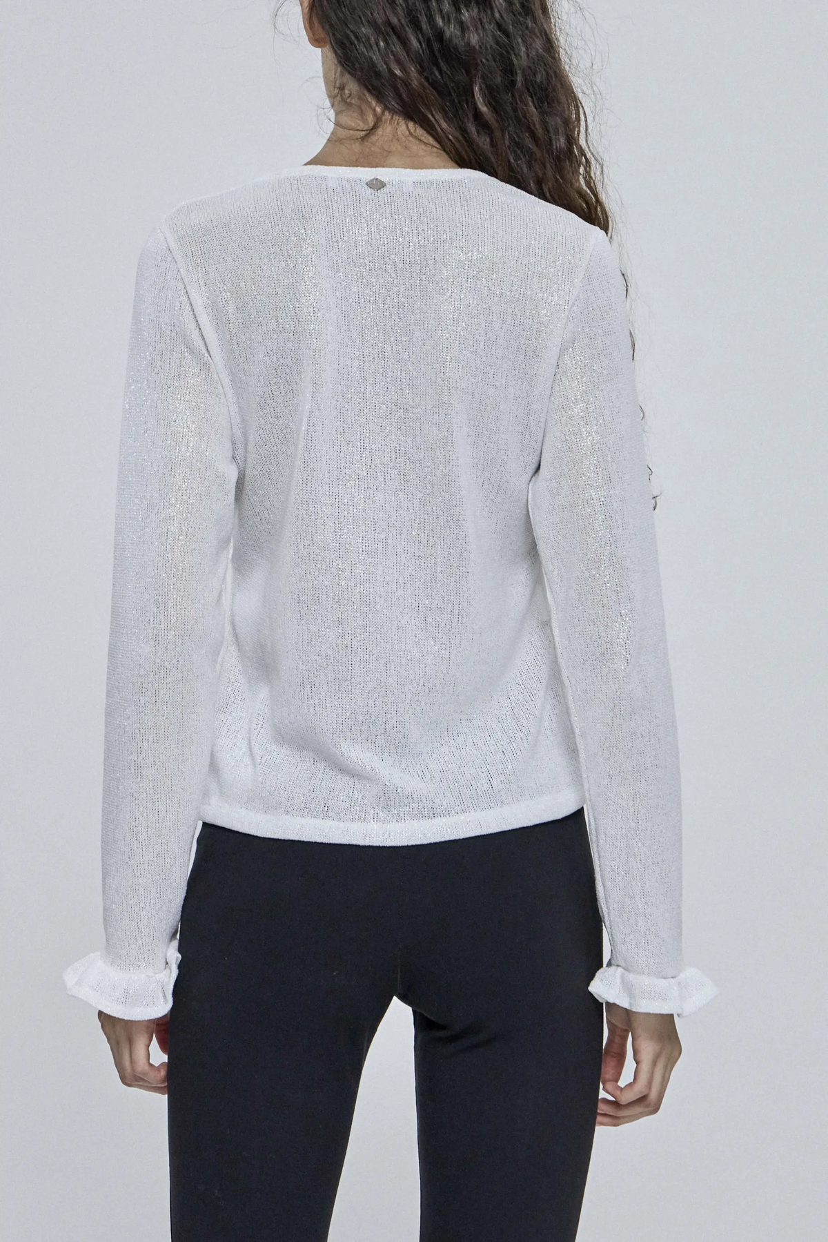 Sweater linea noche confeccionado en tejido 98% poliéster 2% spandex. EscoteV con detalle de volado en puños. Calce slim y largo hasta cadera